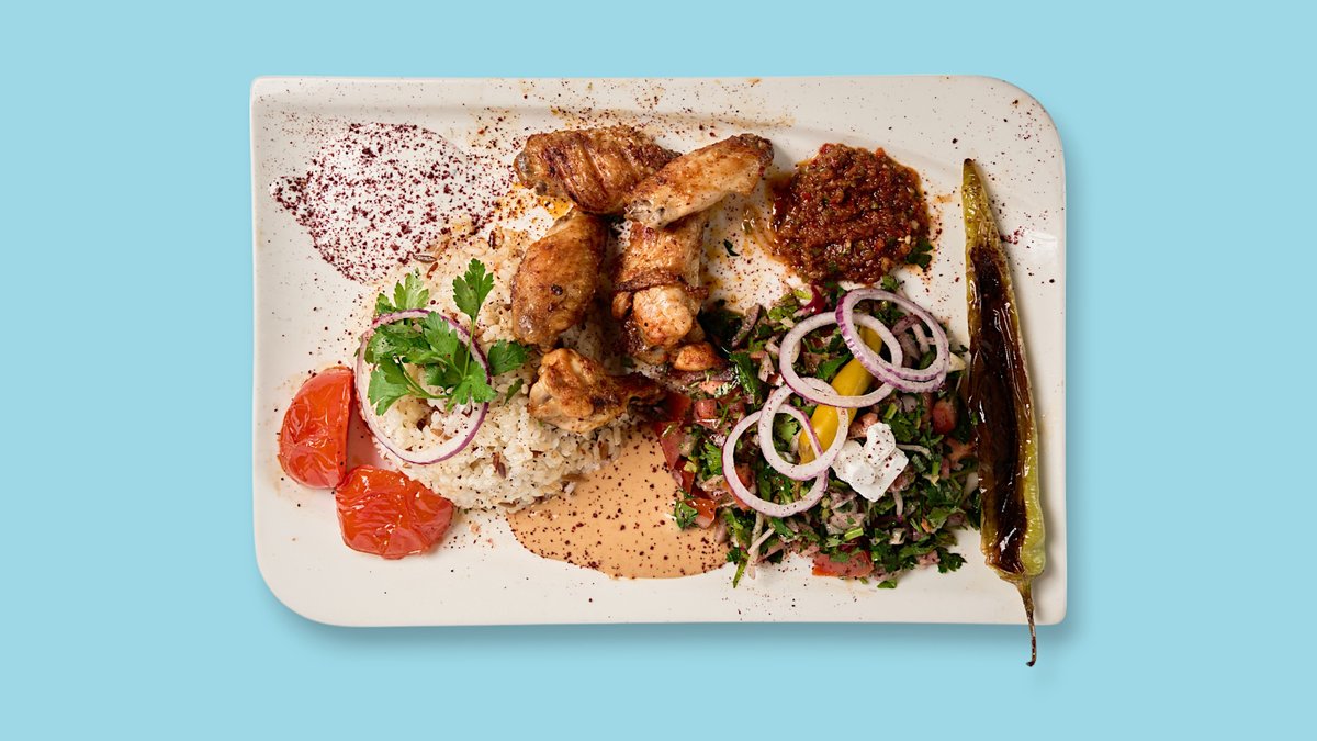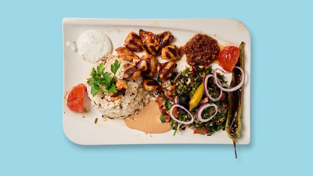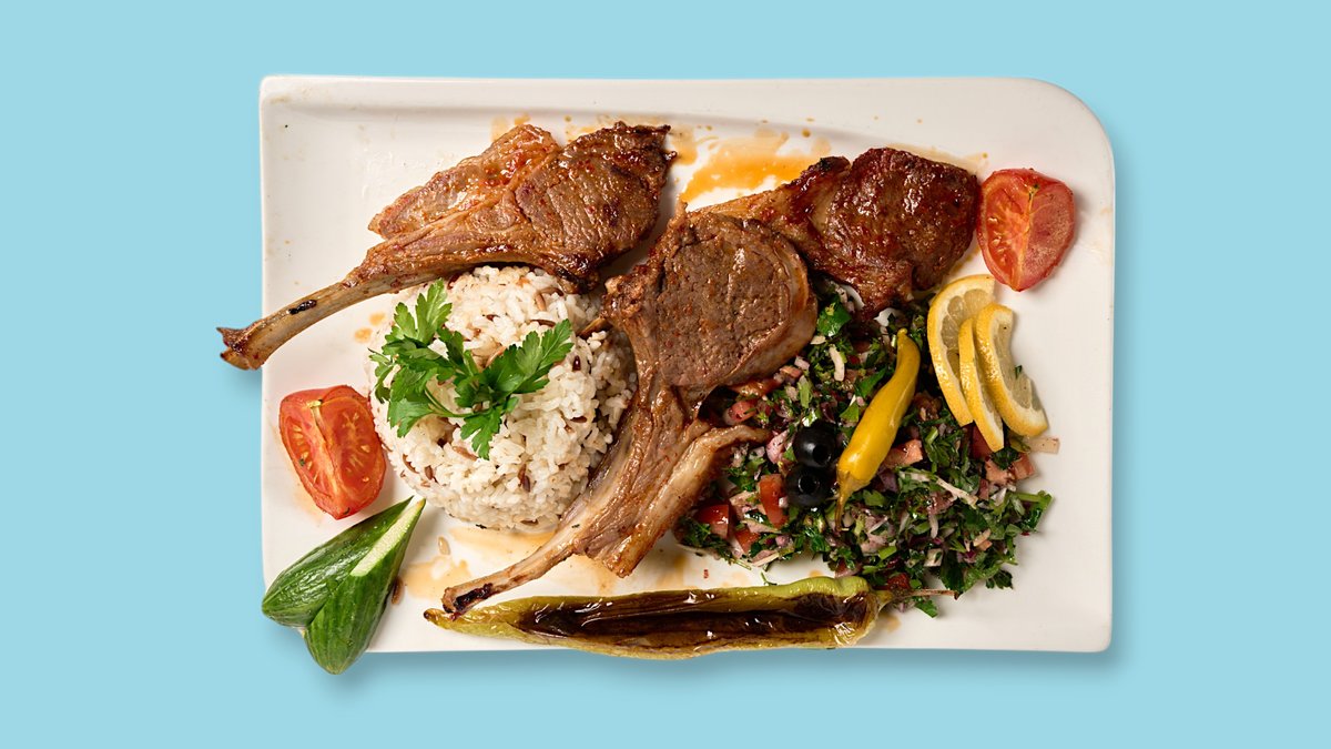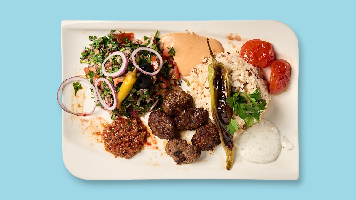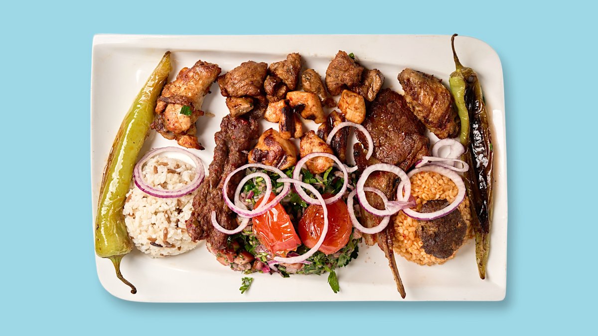 mit 1x Adana, 1x Lammkotelett, 1x Hähnchenstück, 1x Lammspieß, 1x Köfte vom Rind- und Kalbfleisch, Reis, Salat und einer Soße deiner Wahl