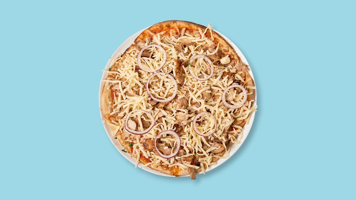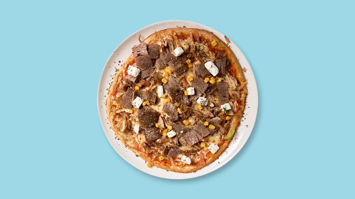 mit gemischtem Dönerfleisch vom Kalb- und Hähnchenfleisch, Weichkäse und Mais