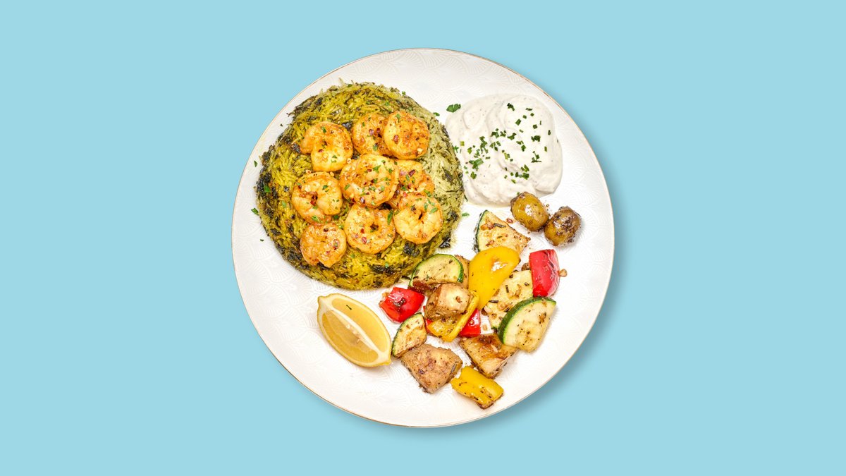 mit Seehechtsreifen, knusprigen Garnelen, Keblinge und einer Beilage deiner Wahl