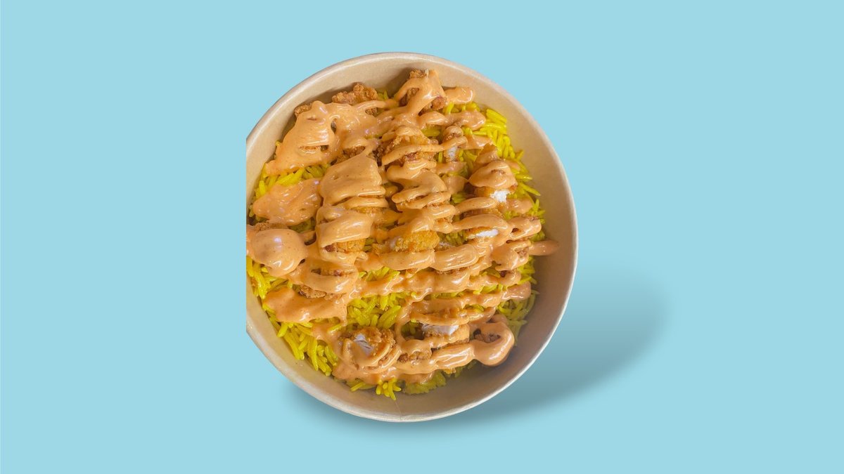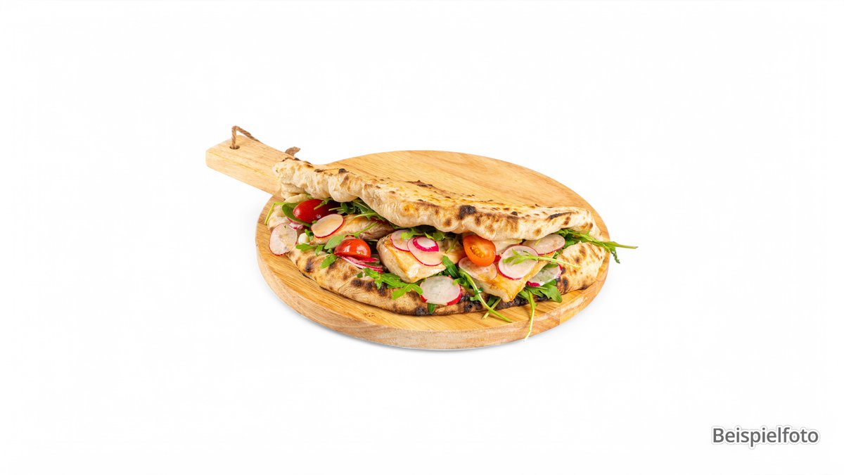 mit marinierten Hähnchenbruststreifen, Paprika, Champignons, Zwiebeln, Käse, koreanischer Barbecuesoße und Mayonnaise