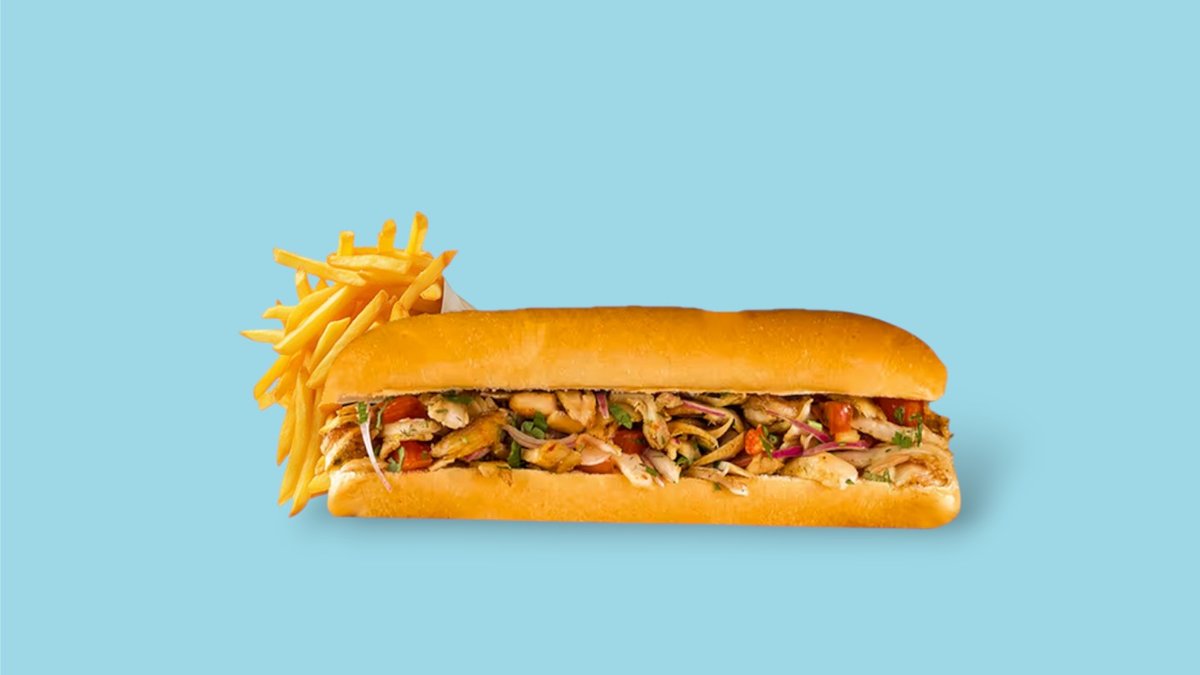 mit gewürztem Hähnchenfleisch vom Drehspieß, Knoblauchsoße und Gewürzgurken