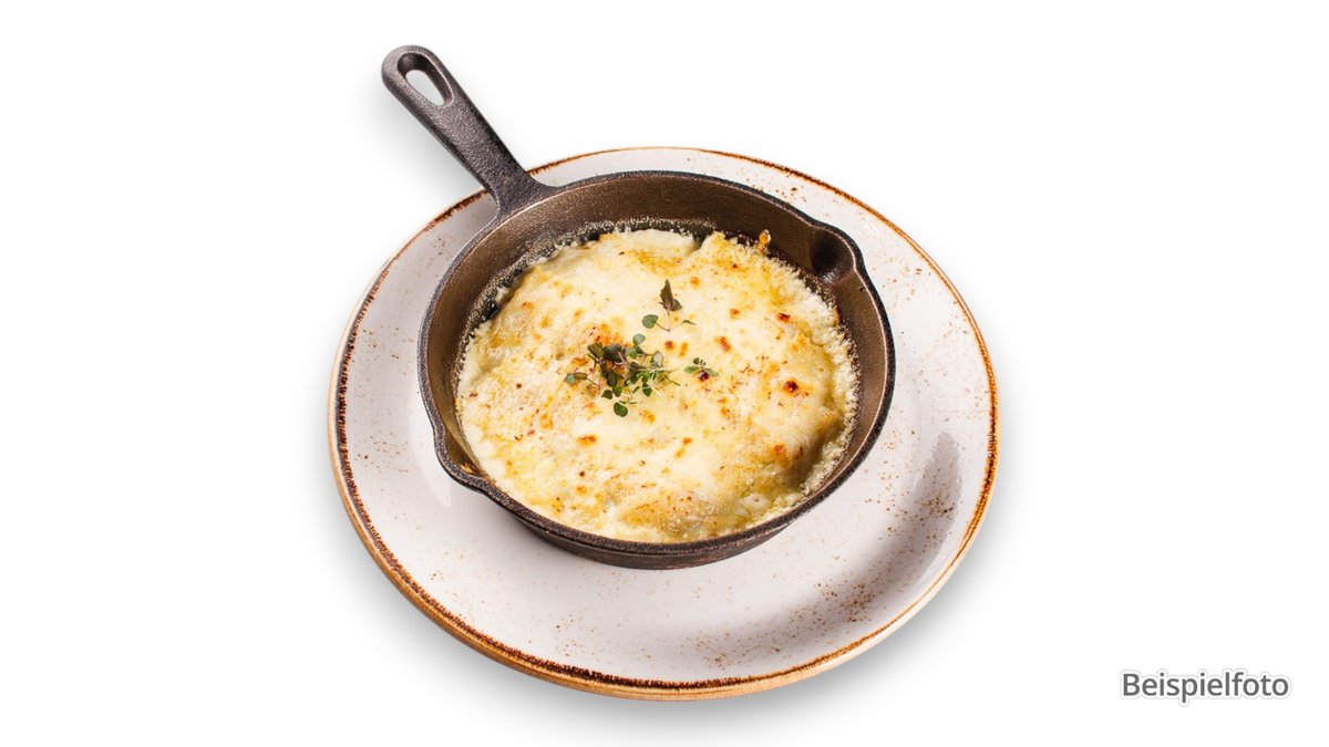 im Lehmofen geschmortes Gemüse mit Brokkoli in Sahnesoße und mit Käse überbacken