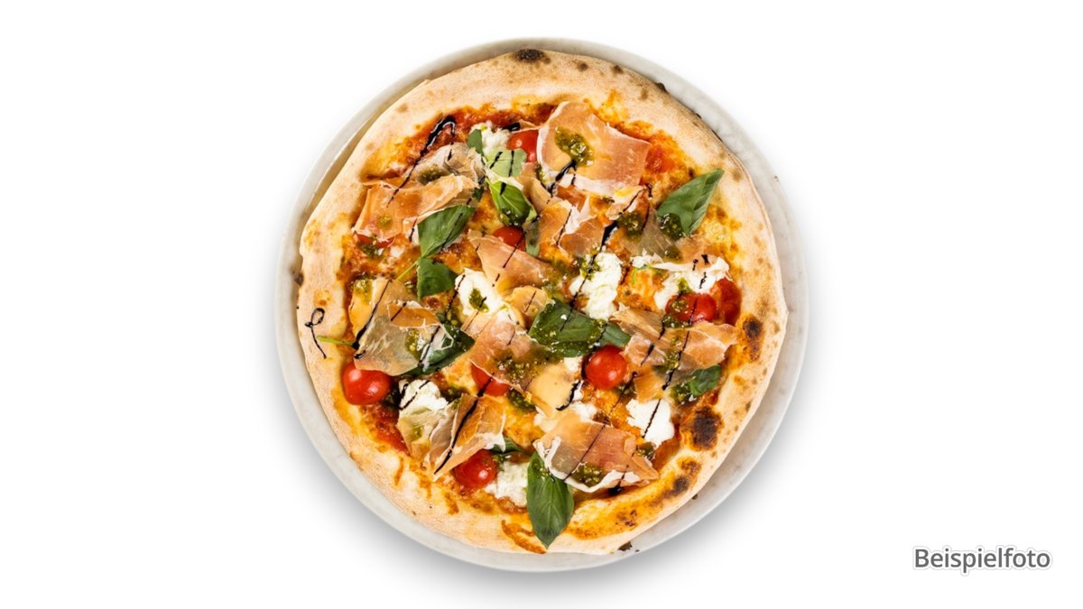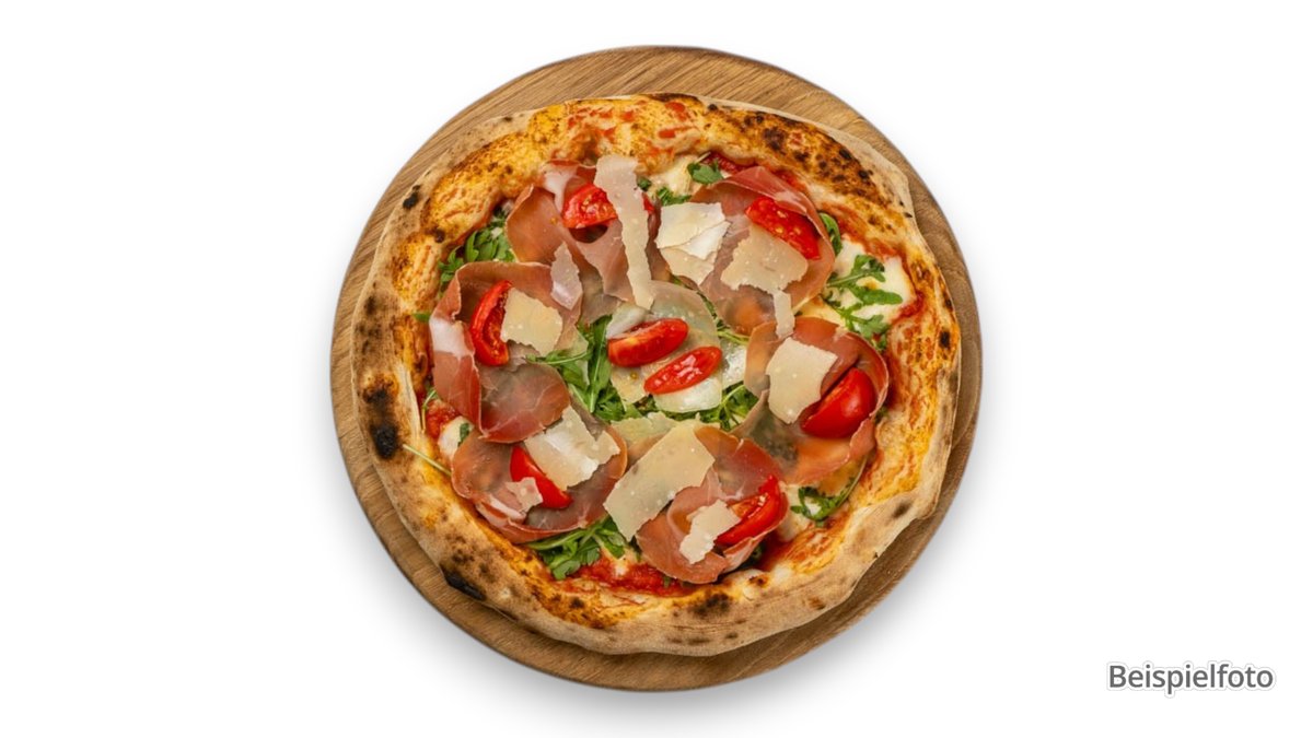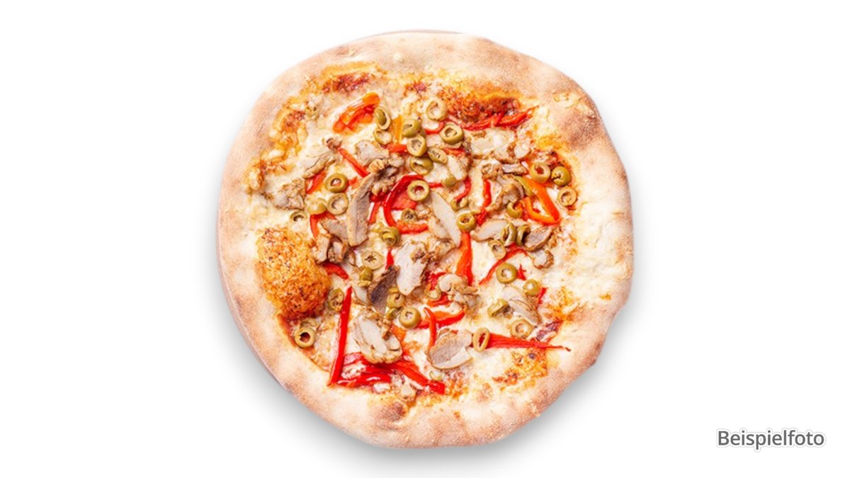 mit Tomatensoße, Käse, Salami vom Truthahn, Schinken vom Truthahn, Champignons, Paprika, Thunfisch und Olivenmix