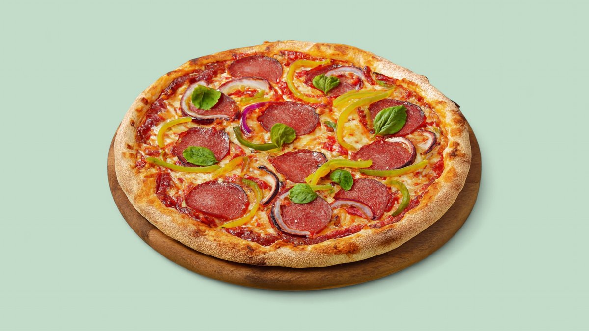 mit Tomatensoße, Käse, Peperoni, Peperonisalami vom Truthahn, Knoblauch, Bolognese vom Rind und roten Zwiebeln