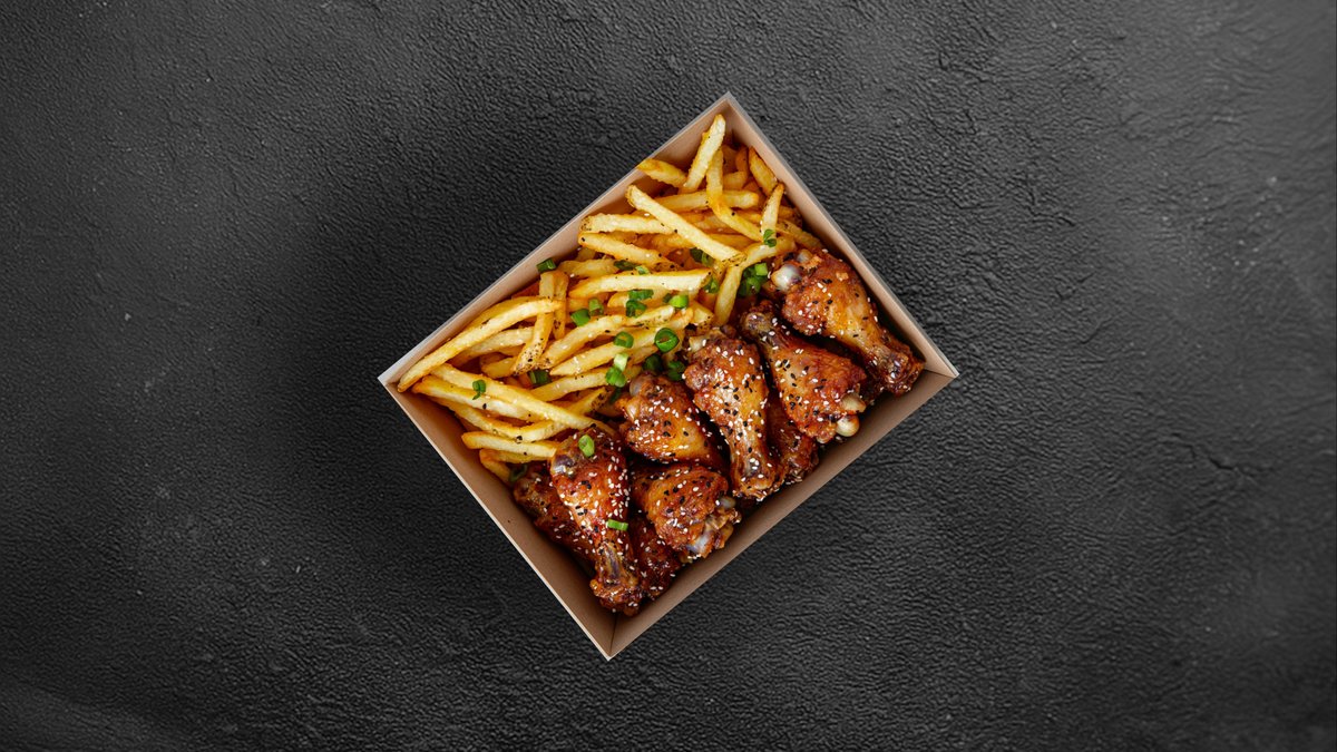 Knusprige Fried Chicken Wings, perfekt gewürzt und serviert mit goldbraunen Pommes (Halal)