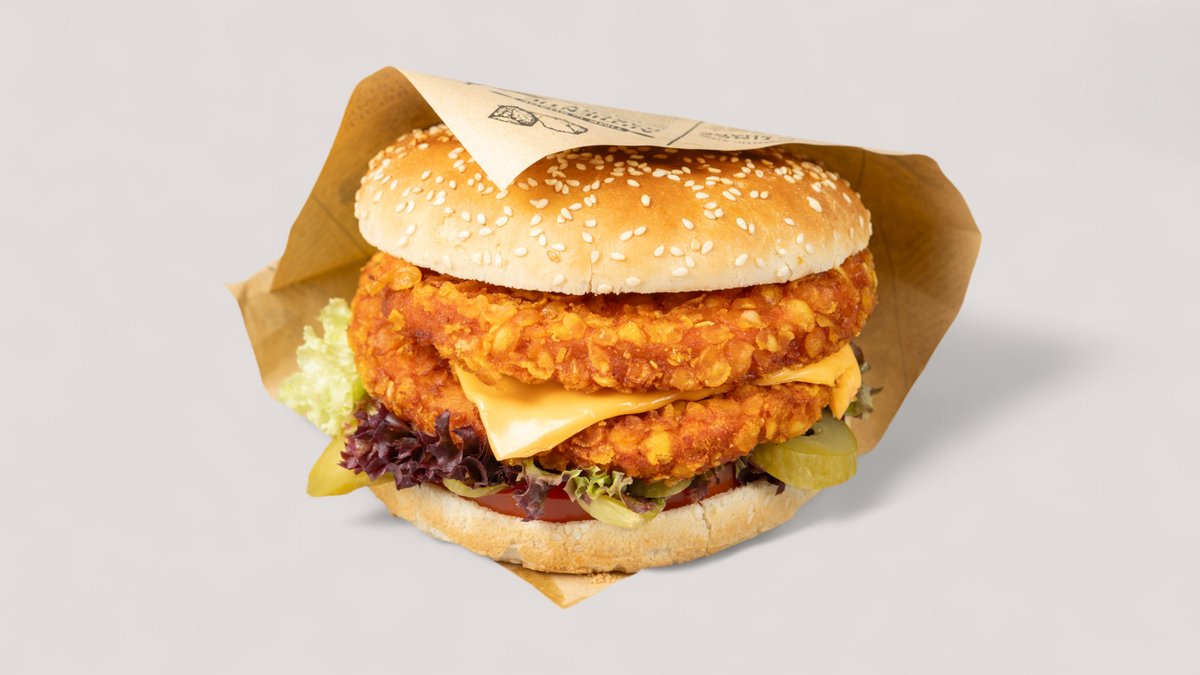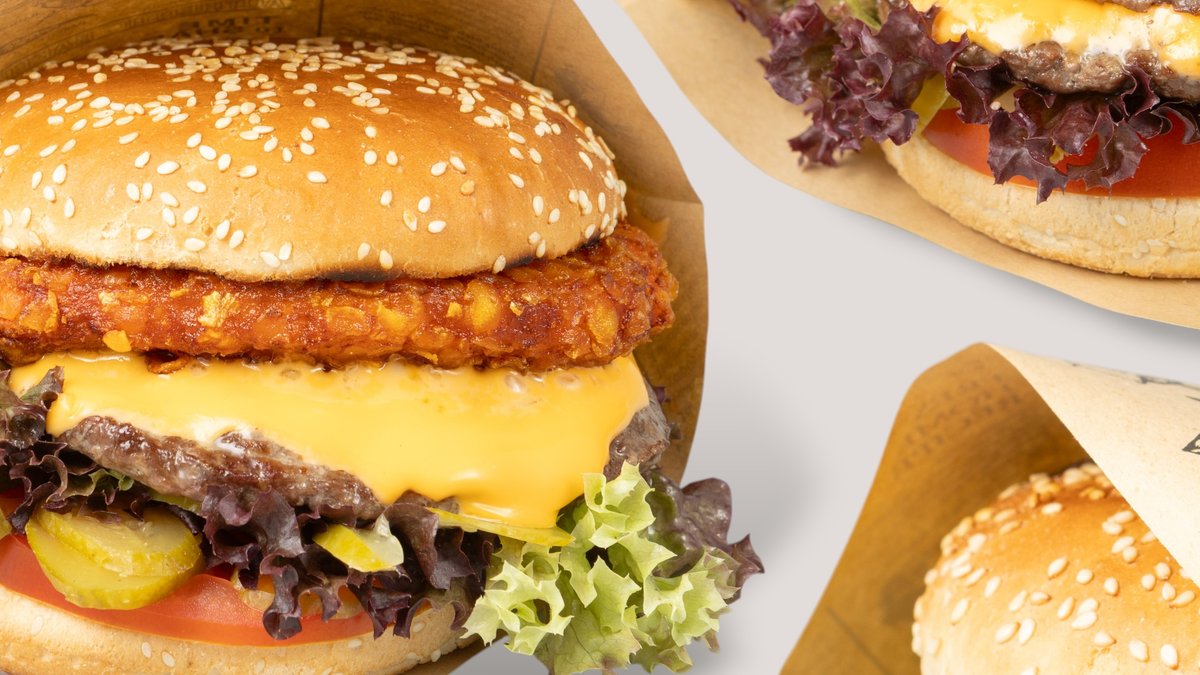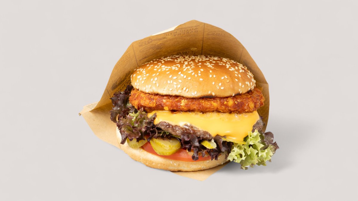 mit 100 g Kalbfleischpatty, knusprigem Hähnchenpatty und Cheddar