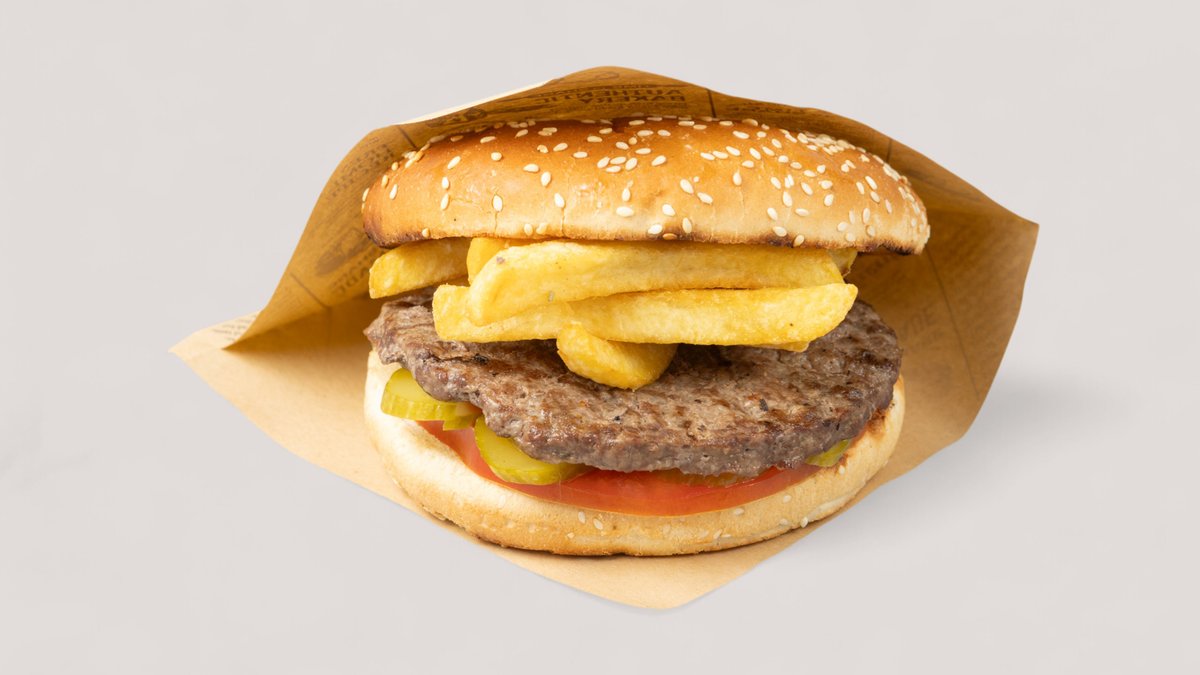mit 100 g Kalbfleischpatty, Pommes frites und Cheddar
