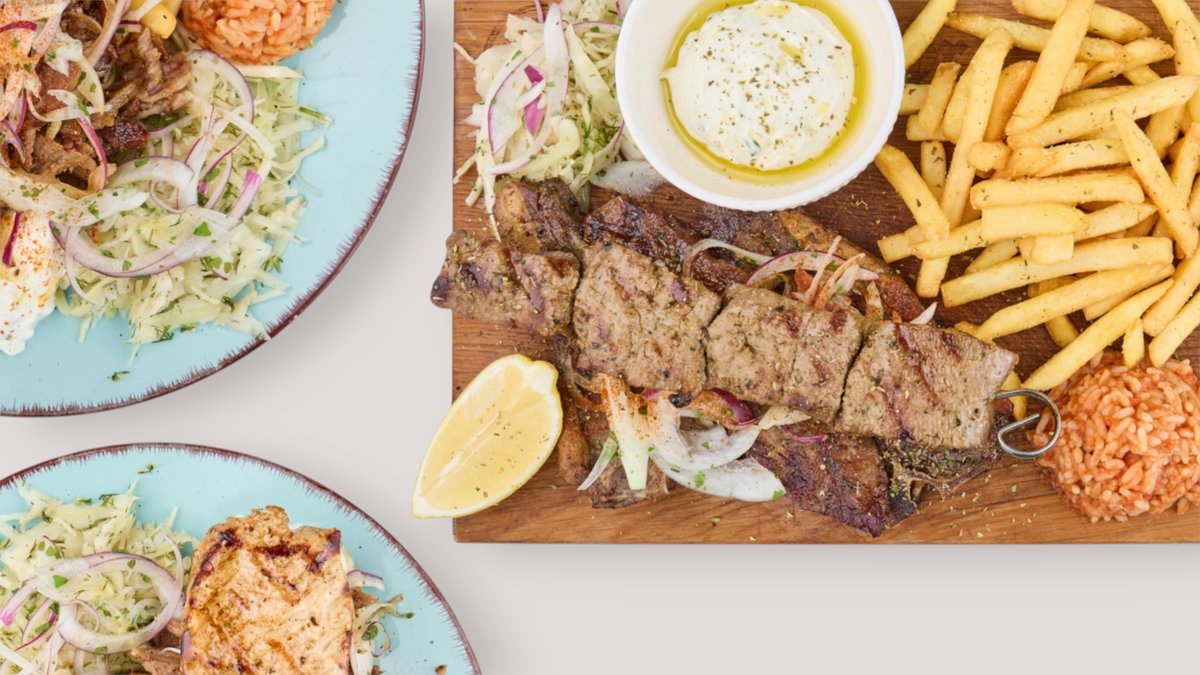 Authentische griechische Küche mit Gyros, Souvlaki, gegrilltem Fleisch, frischem Meerestier und köstlichen Desserts