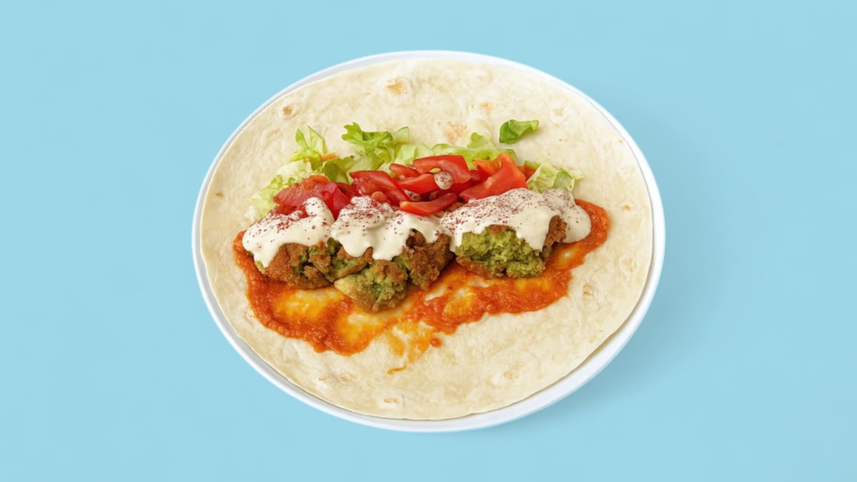 mit Falafeln, milder Paprikapaste, Salat und HummussoĂźe im Tortilla-Brot