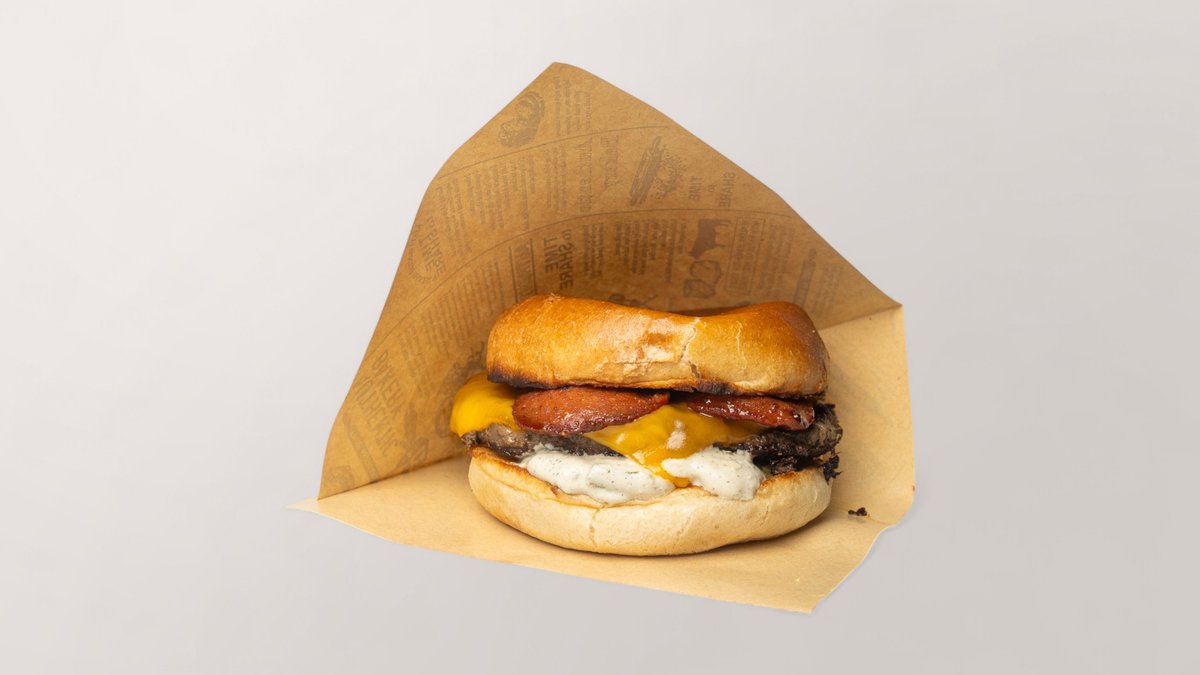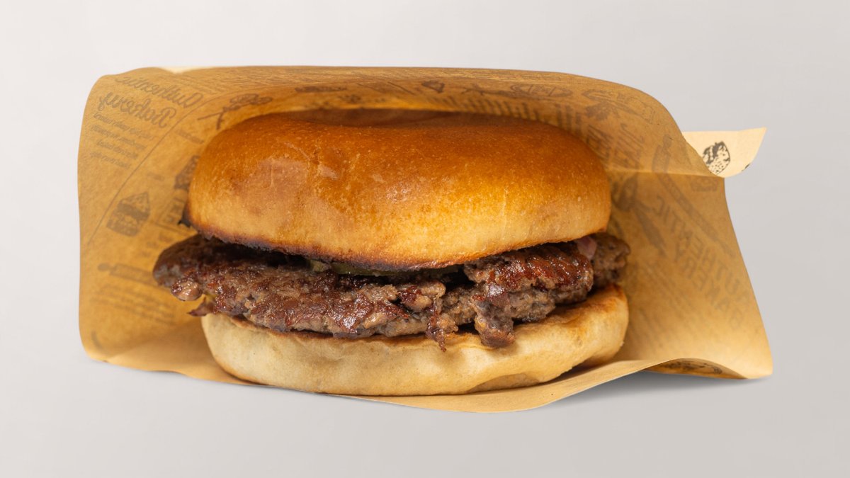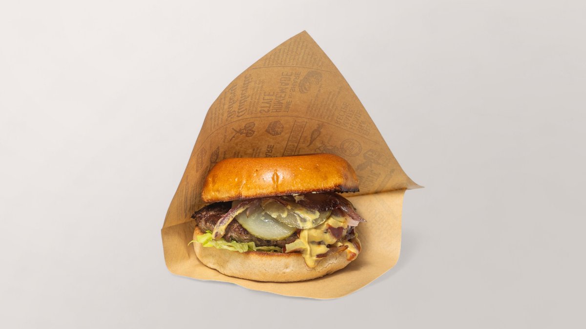 3 gesmashte Rinderpatties (240g), Cheddar, Zwiebel, Gurke, Burgersauce