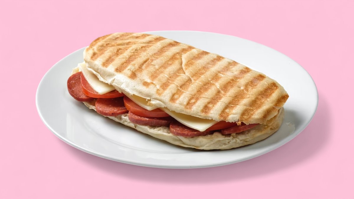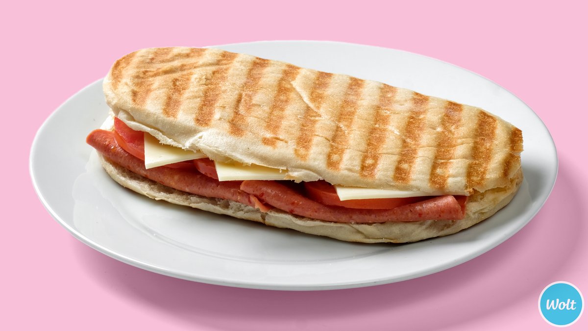 getoastetes Sandwichbrot mit Tomaten, Sucuk, Käse, scharfer Knoblauchwurst und scharfer Soße möglich