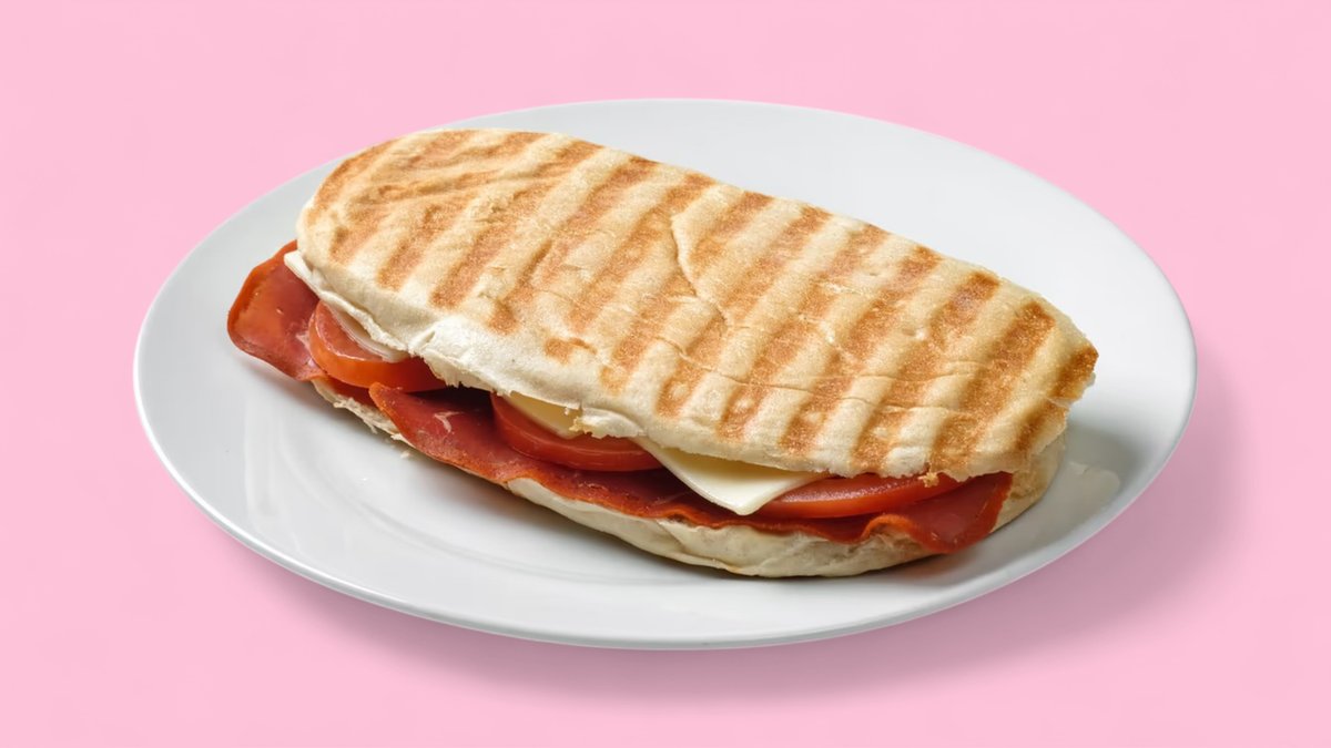 getoastetes Sandwichbrot mit Pastirma, Tomaten, Käse, Rindschinken und scharfer Soße möglich