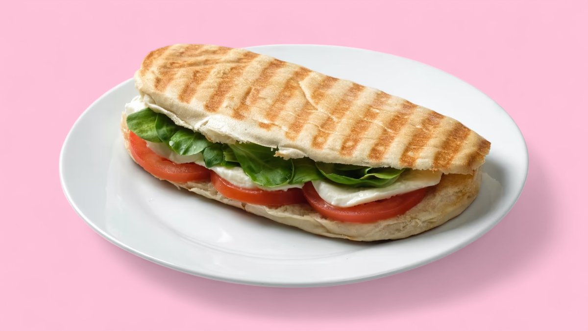 gegrillte Panini mit Tomate, Mozzarella, Balsamico und Feldsalat, Salz und Pfeffer