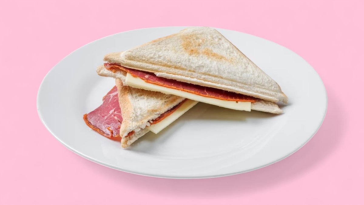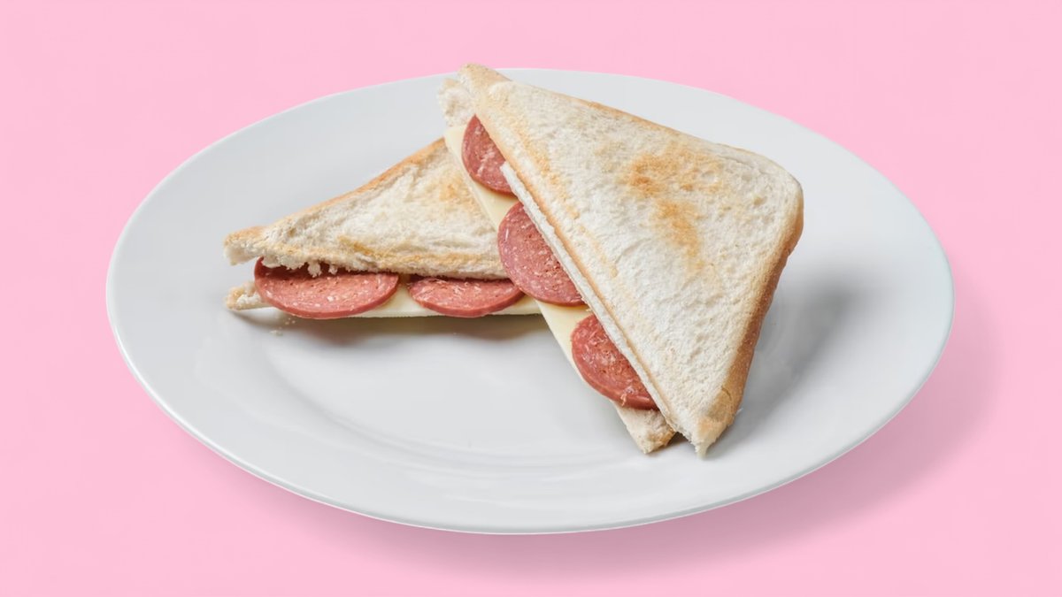 getoastetes Sandwichbrot mit Tomaten, Käse, Rindersalami und scharfer Soße möglich