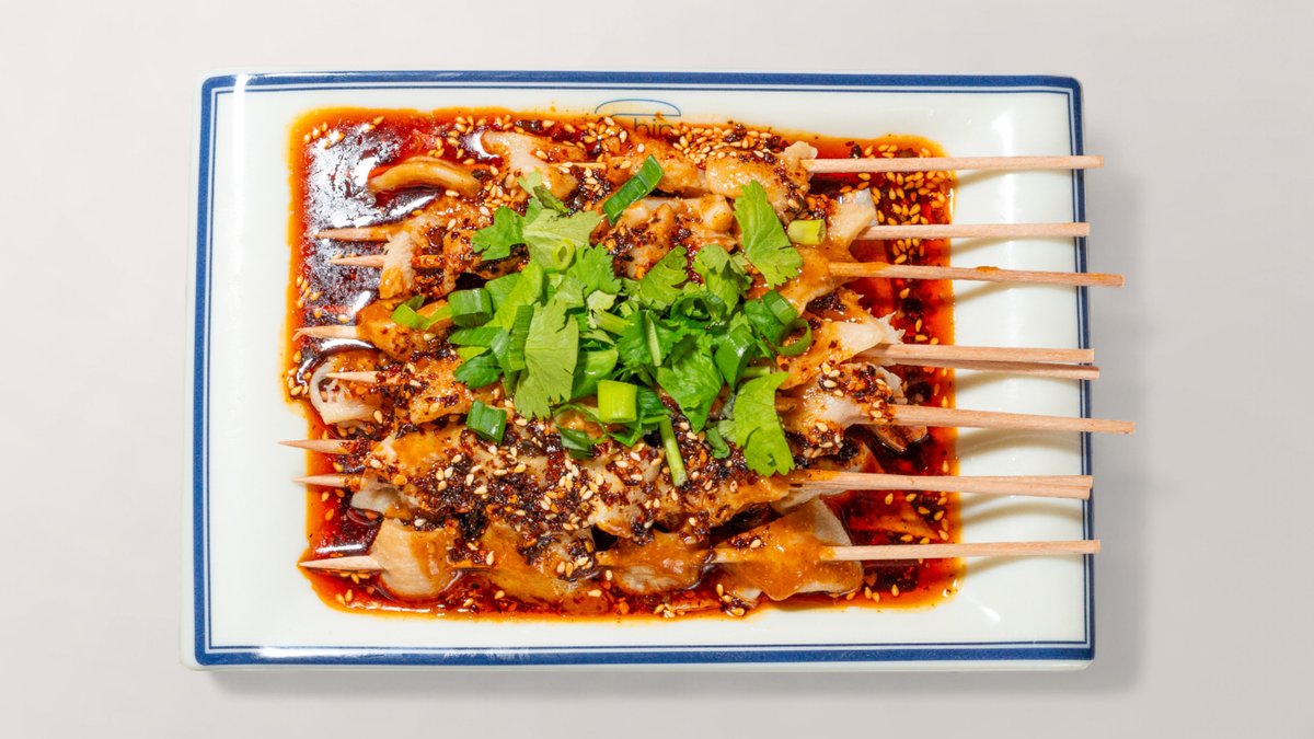 auf Spießen servierter Rinderpansen, mit würziger Spezialsoße übergossen