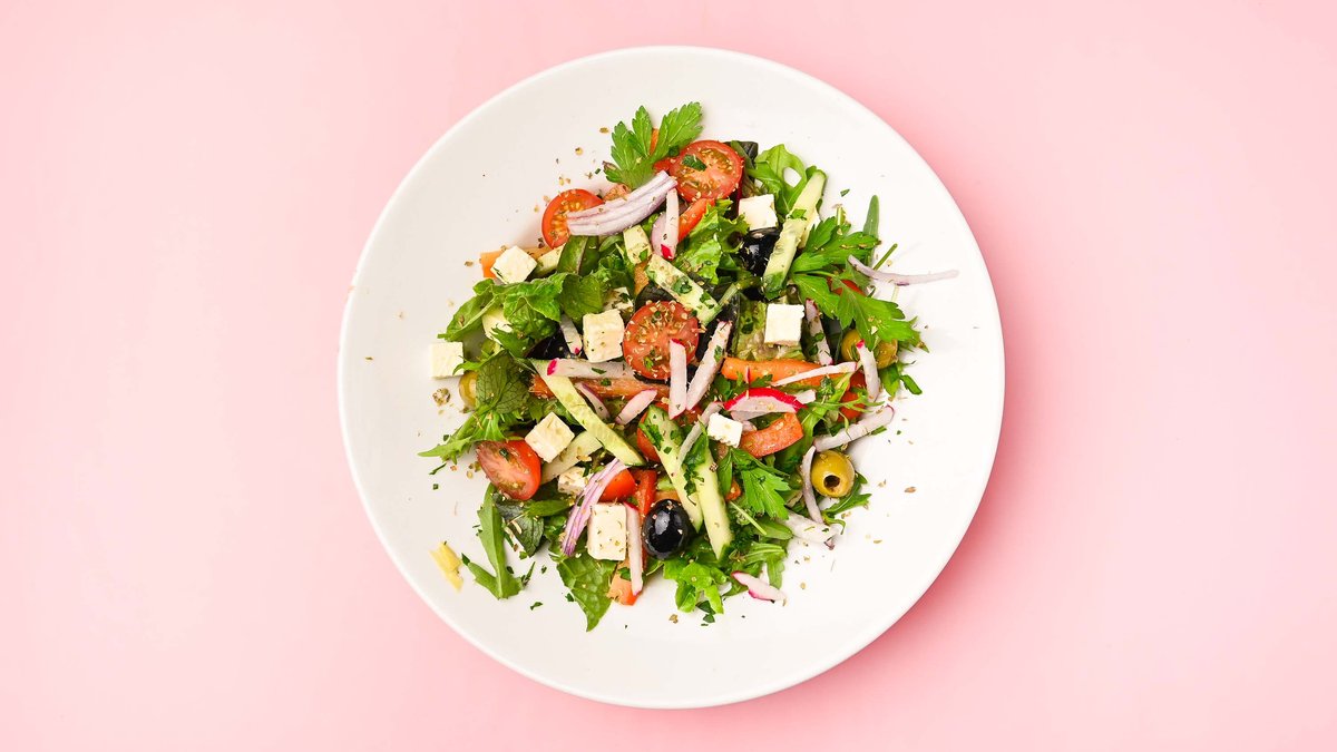 mit Hirtenkäse, Hausdressing, Blattsalat, Gurken, Tomaten, Oregano, Zwiebeln, Paprika und Oliven