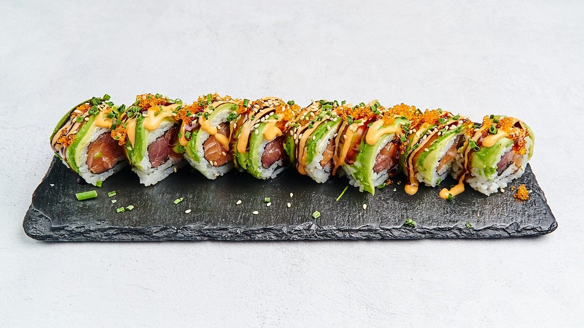 mit Lachs, Thunfisch, Chili, Frischkäse, umhüllt mit Avocado, Fischrogen und scharfer Soße