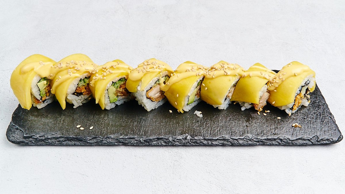 mit knusprigem Ebi-Fry, Mango, Frischkäse, umhüllt mit Avocado, Thunfisch, Lachs, Butterfisch, Sesam und Mango-Mayonnaise