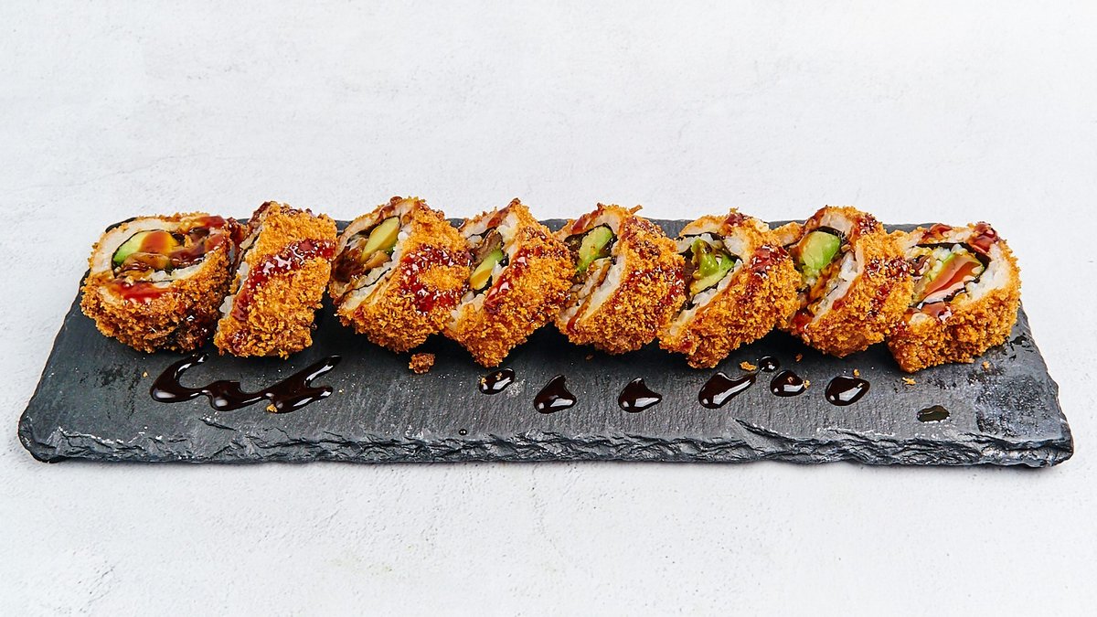 frittierte Rolle mit Avocado, Surimi, Lachs, Unagi-Kürbis, Unagi-Soße und scharfer Mayonnaise