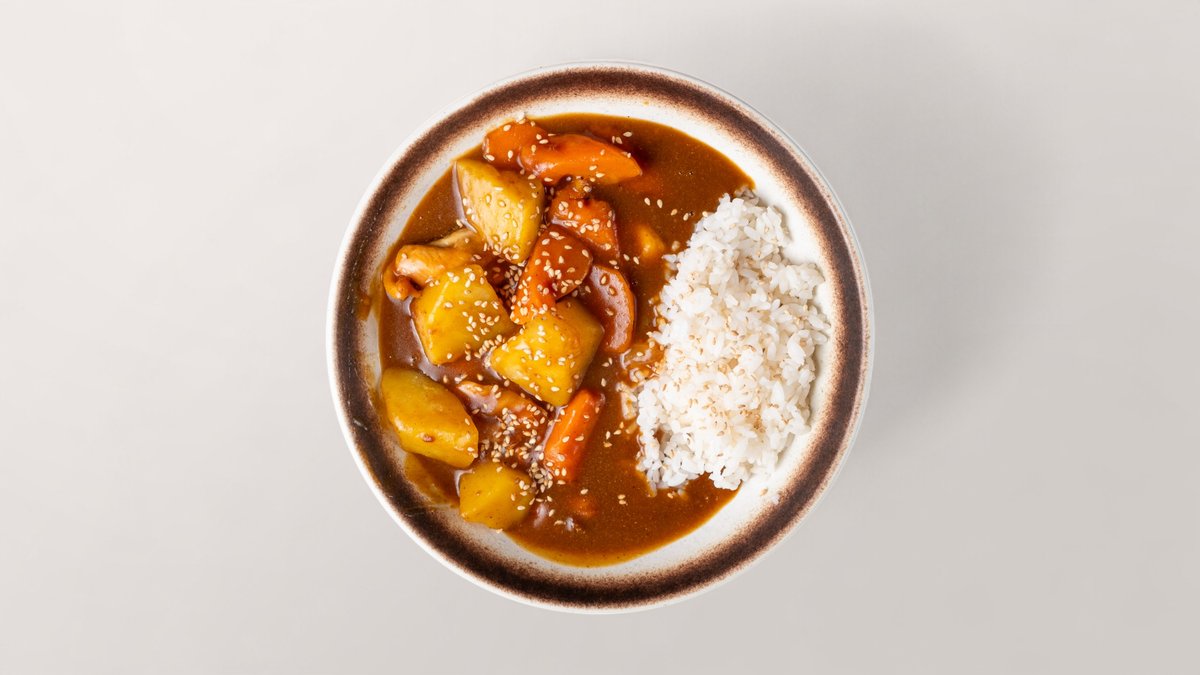 mit Hähnchenfleisch, Kartoffeln, Möhren, Zwiebeln mariniert in japanischer Currymischung und Reis