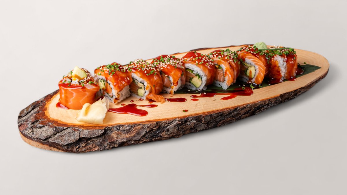 mit Lachs, Chili, Avocado, Rucola, Lauch-Tempura, Frischkäse, umhüllt mit Lachs, Sesam, Schnittlauch, Unagi-Soße und scharfer Soße