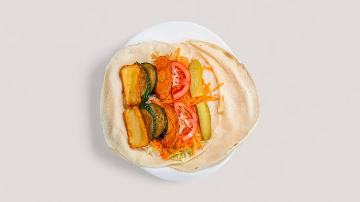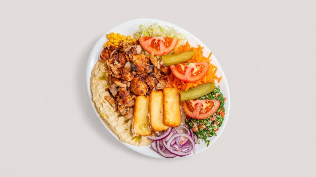 mit Schawarma vom Hähnchen und Halloumi