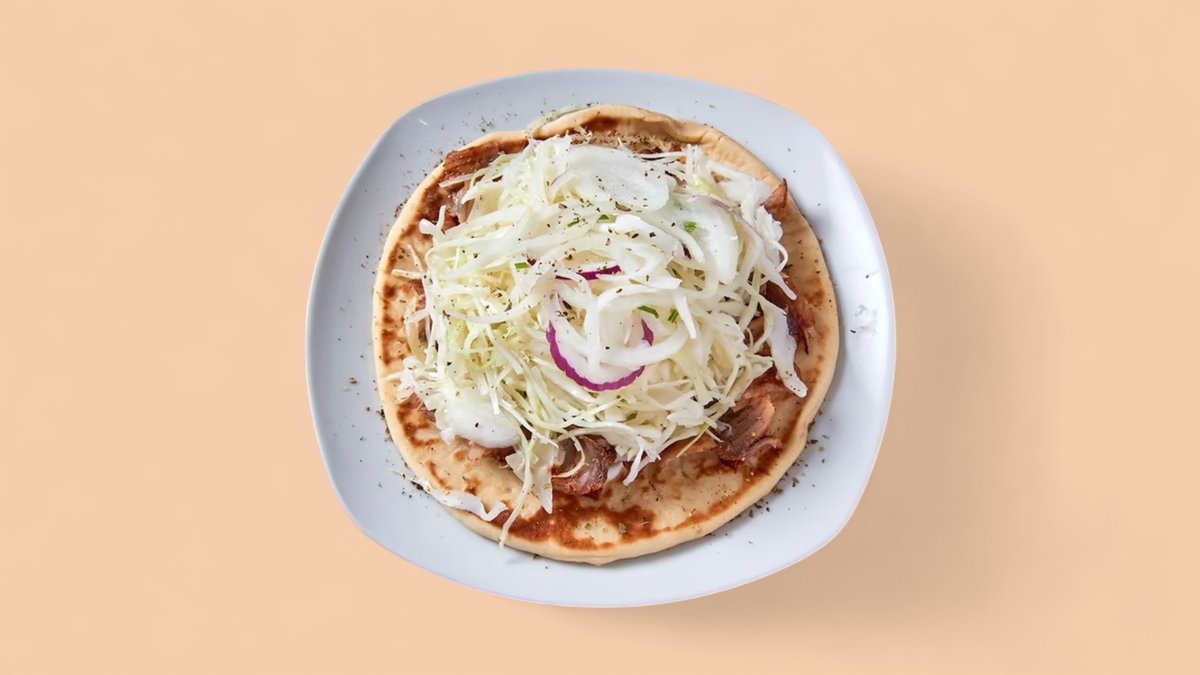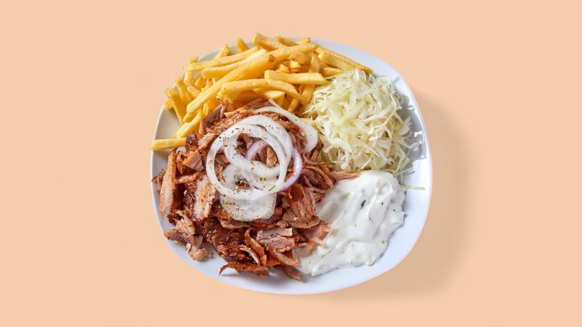Gyros mit Pommes frites, Krautsalat, Zwiebel und Tzatziki