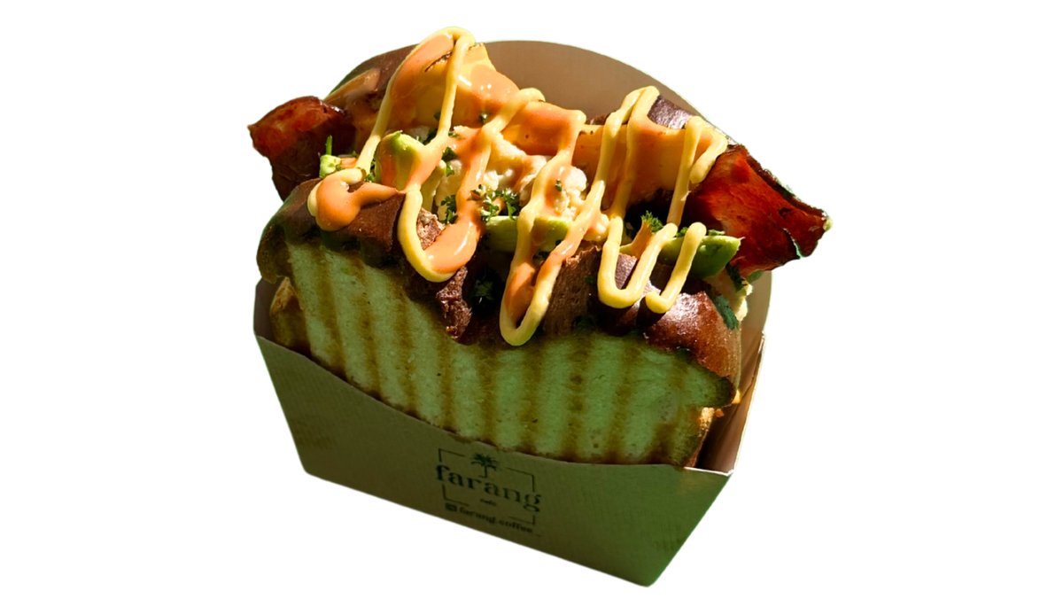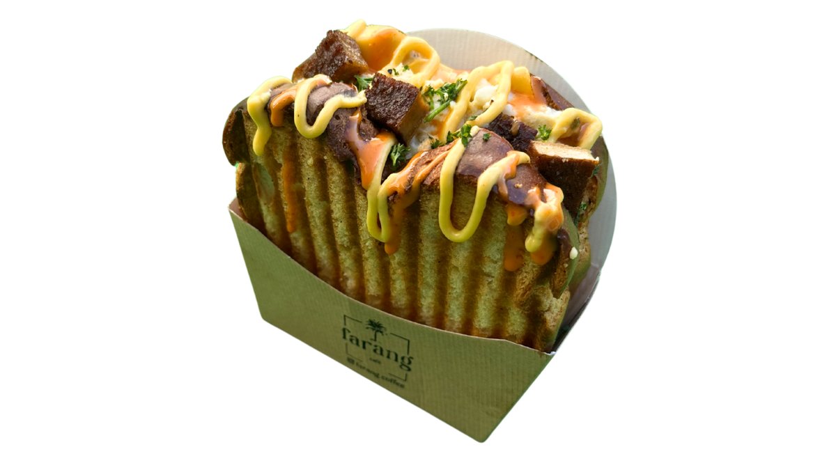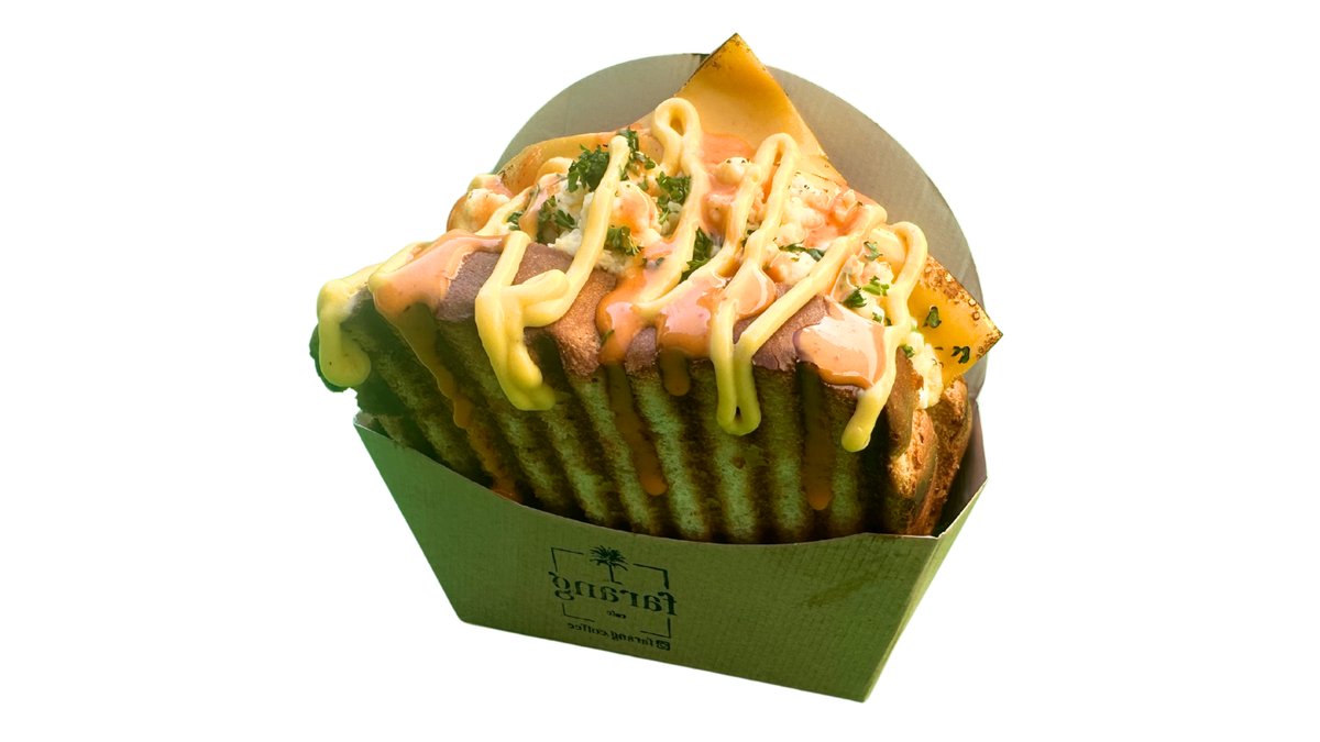 cremig-fluffiges rührei, würziger cheddar cheese zwischen zwei dicken scheiben brioche brot, käse sauce, sriracha mayonnaise, frische petersilie