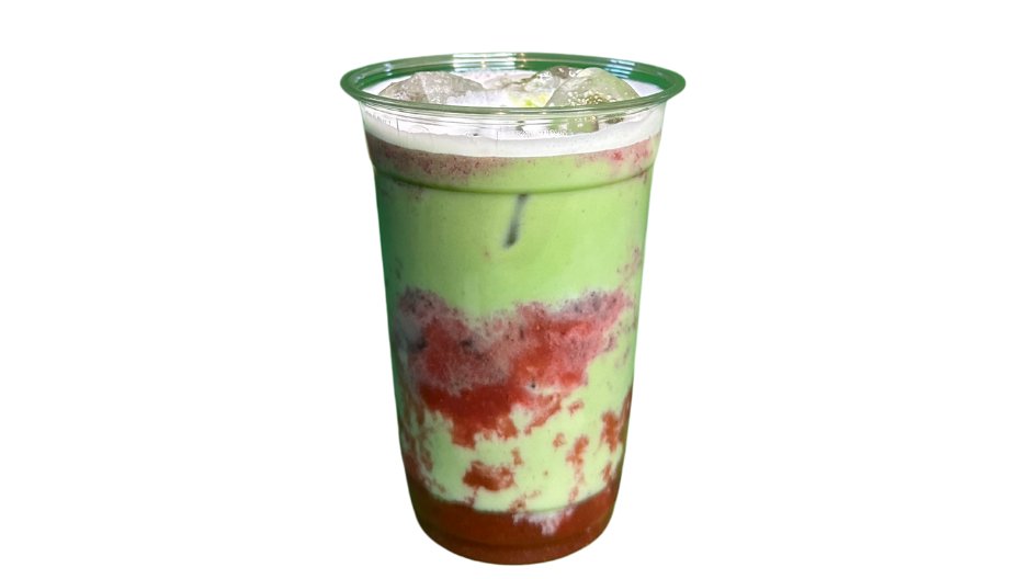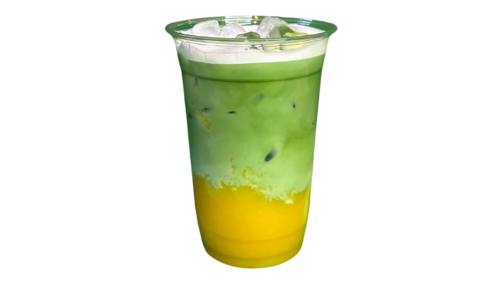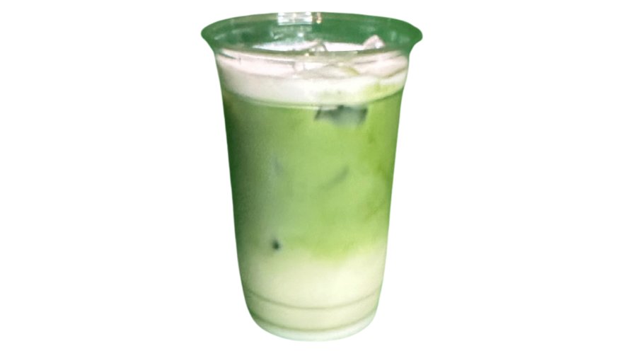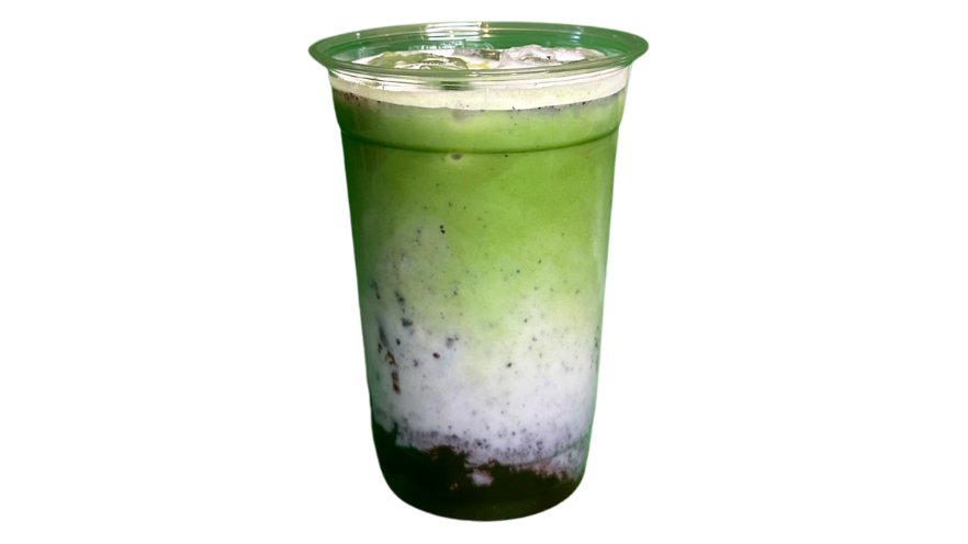 Matcha-Pulver aufgelöst in kalter Milch, auf Eis serviert.