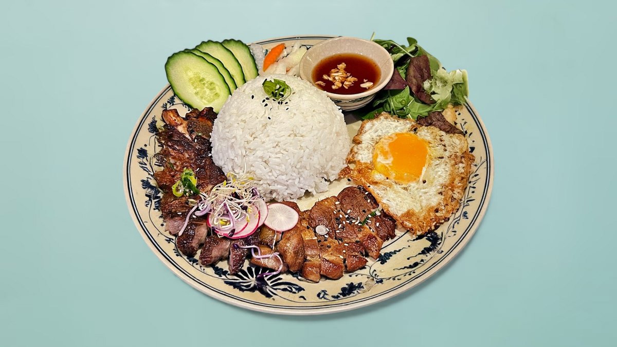 Gegrillte Schweinerippen, Spiegelei, Gurken, Tomaten, frischem Gemüse und süß-saurer Fischsauce