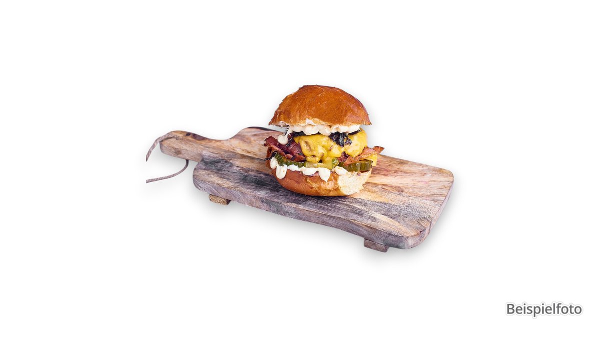 alle Burger werden im Brioche-Bun mit hausgemachtem 180-g-Beef-Patty, Pommes Frites, Ketchup und Mayonnaise serviert