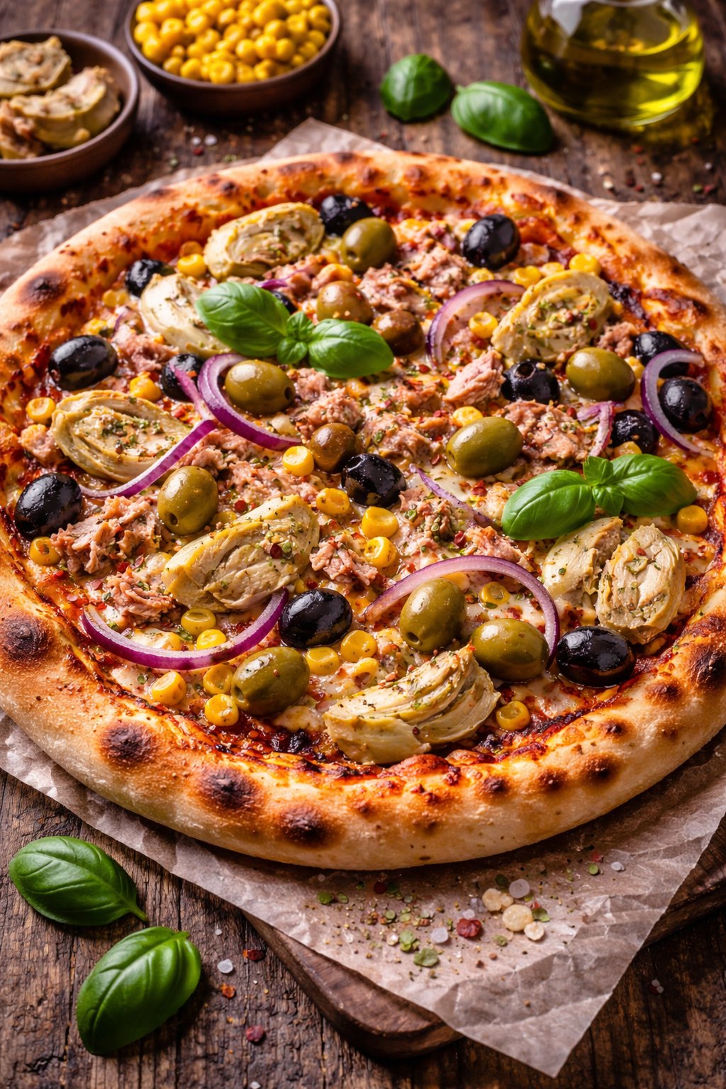 mit Thunfisch, Mais, Artischoken, Zwiebeln und Oliven
