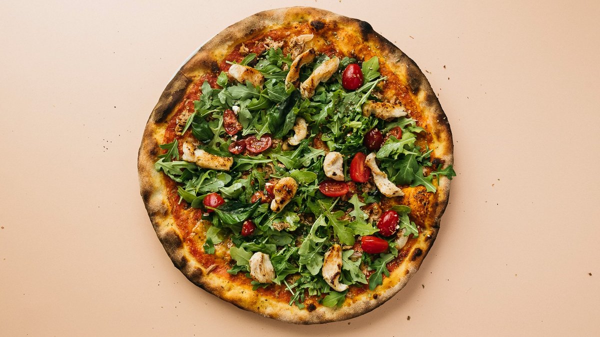 mit Rucola, Parmesan, Hähnchenstreifen und Kirschtomaten