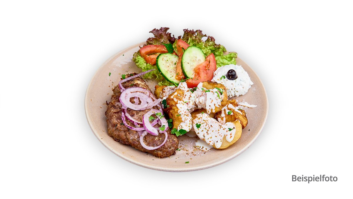 mit Tsatsiki, roten Zwiebeln, Oliven, Pommes frites und Salat