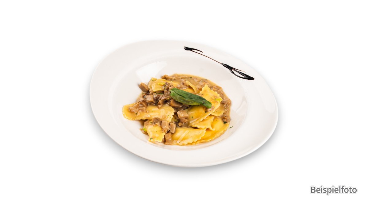 mit Waldpilzen, Gemüse, hausgemachten Pommes frites und Salat