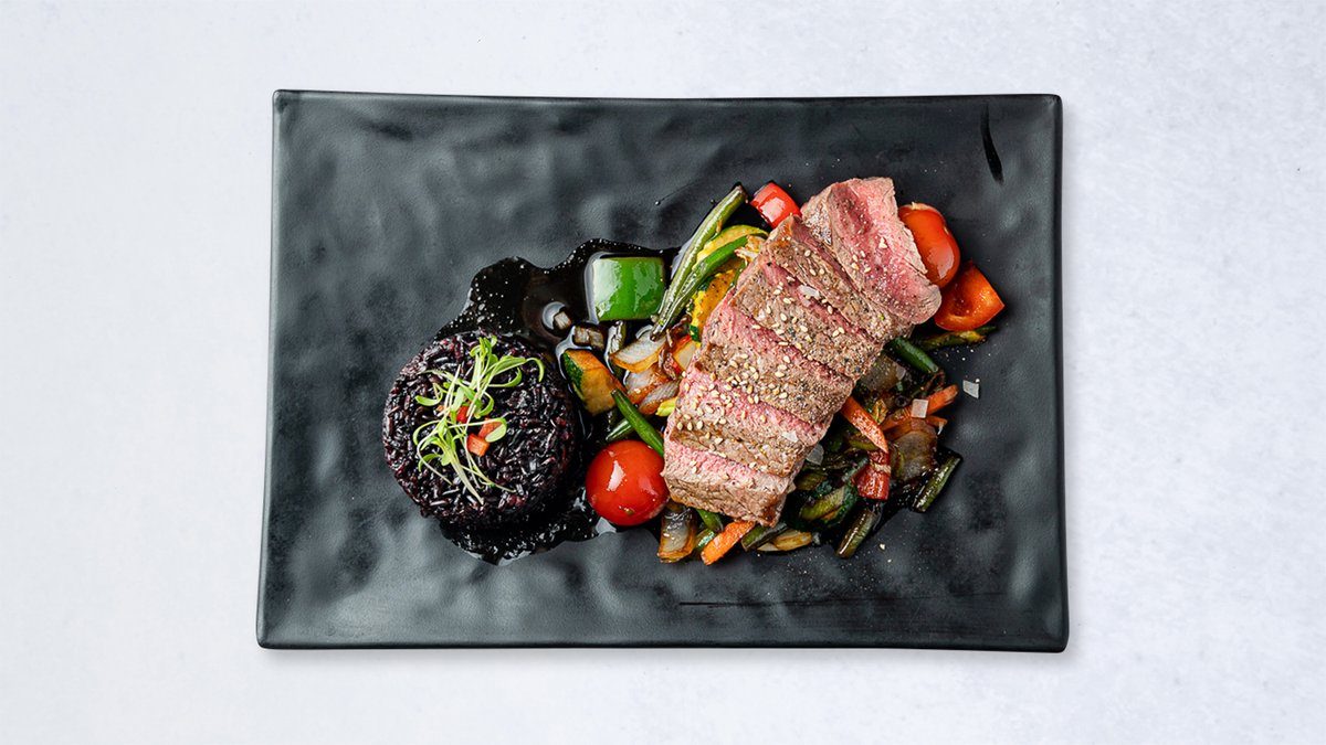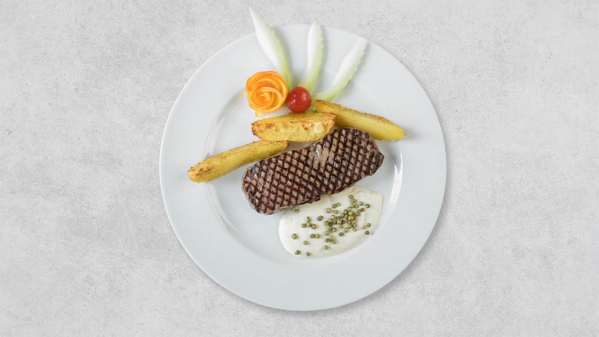 alle Gerichte sind ca. 250 g und werden mit Pommes frites und Beilagensalat serviert („841. Funghi argentinisches Rumpsteak“ wird ohne Pommes frites serviert)