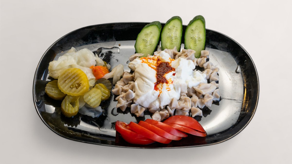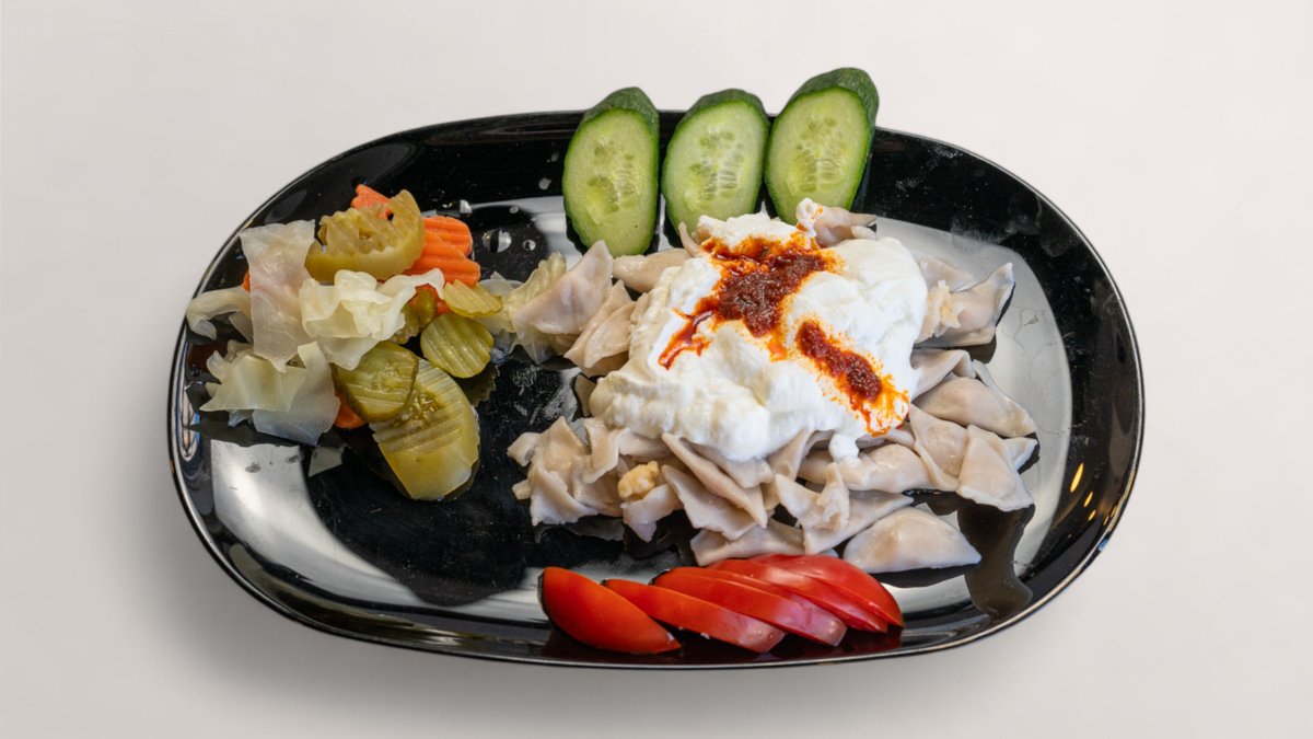 alle Manti werden mit Tomatensoße und Joghurt nach Wahl serviert