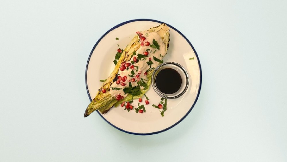 im Ofen gerösteter Spitzkohl serviert mit Tahini-Sauce, Granatapfelmolasse, frischen Granatapfelkernen, Maldon Sea Salt und Petersilie
