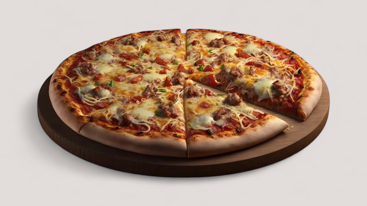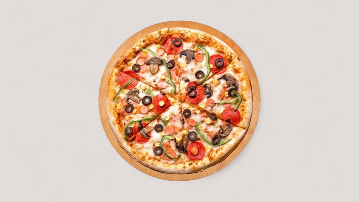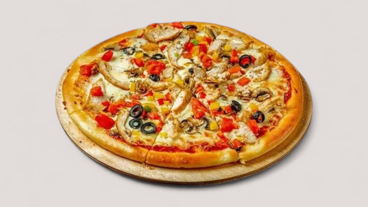 scharf mit Hähnchen, Tomaten, Zwiebeln, Champignons, Mais, Paprika und Cocktailsoẞe