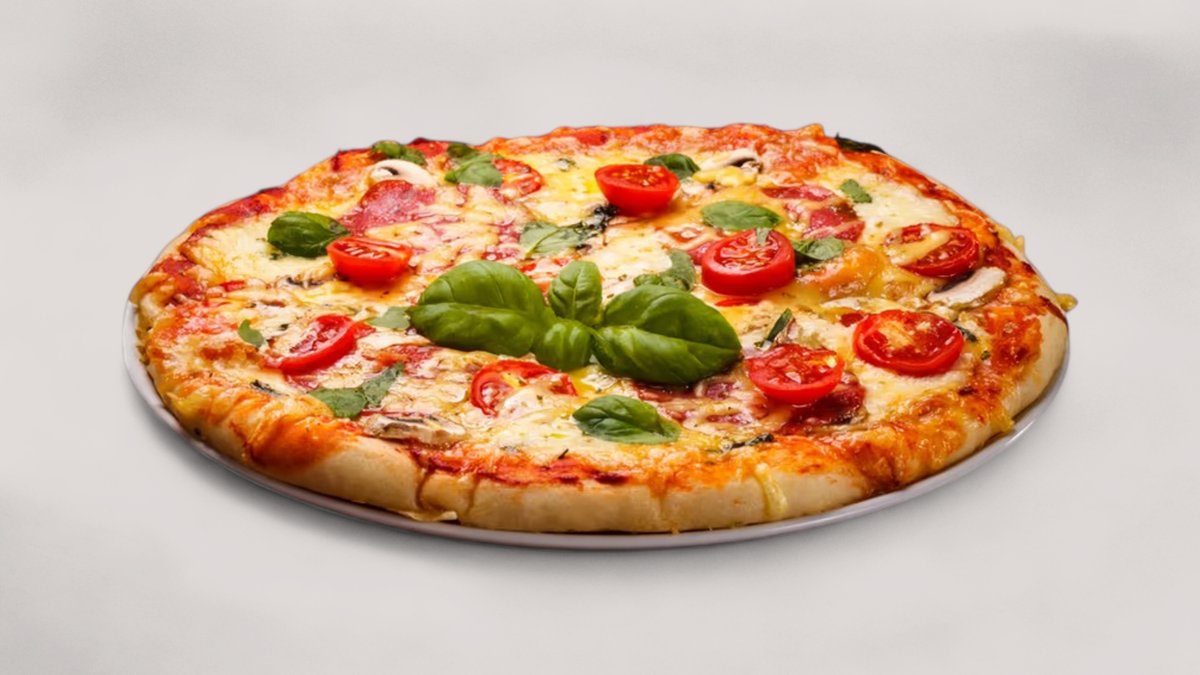alle Pizzen sind ca. Ø 28 cm groß und werden mit Tomatensoße zubereitet („Pizza Gemüse” wird ohne Tomatensoße zubereitet)