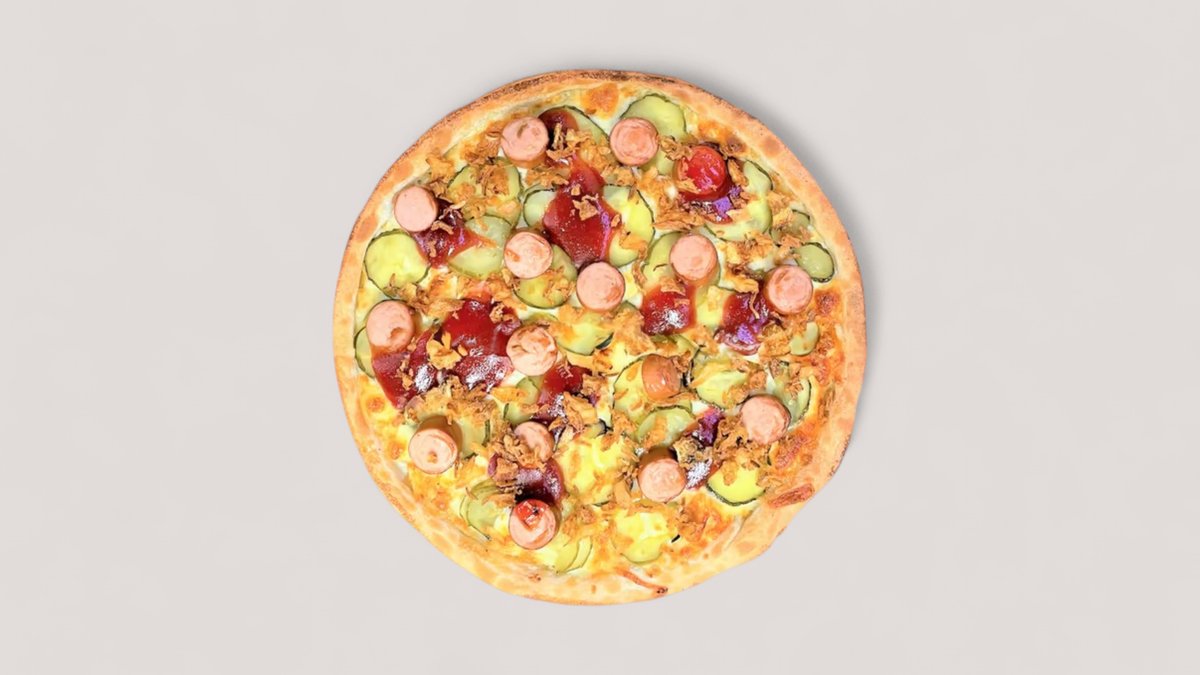 mit Hähnchen, Salami, Hot Dog, Champignons und Paprika