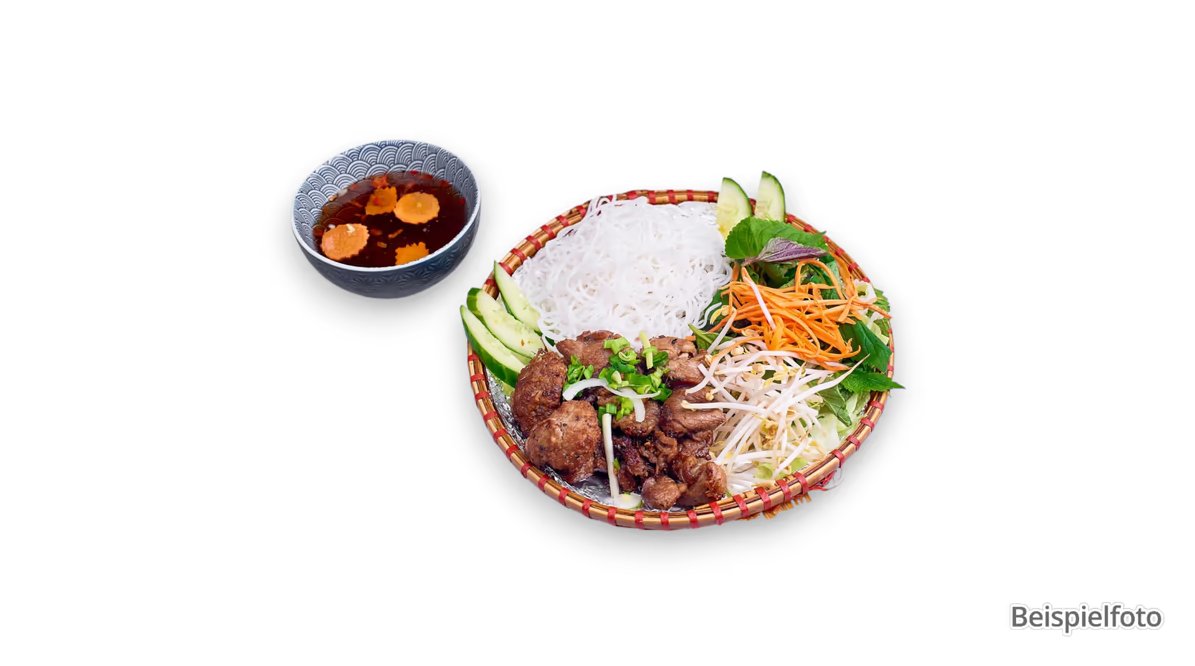 lauwarmen Reisnudeln mit gegrilltem Schweinefleisch, frischem Salat, Sojasprossen, Koriander, Minze, Röstzwiebeln und Erdnüssen, dazu Chili-Limetten-Dressing