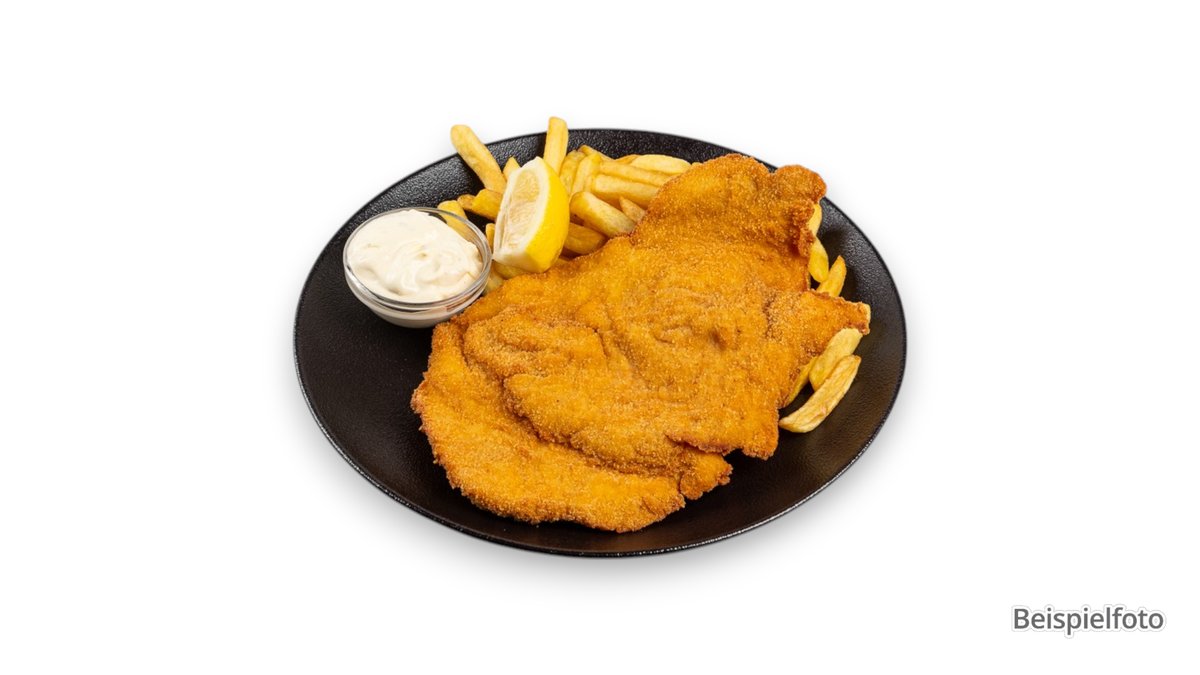 mit Pommes frites, Tsatsiki und Beilagensalat