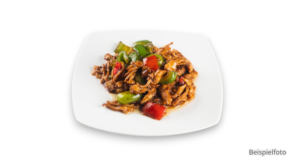 mit Oliven, gebratenen Putenstreifen, Champignons, Zwiebeln und Sojasoße
