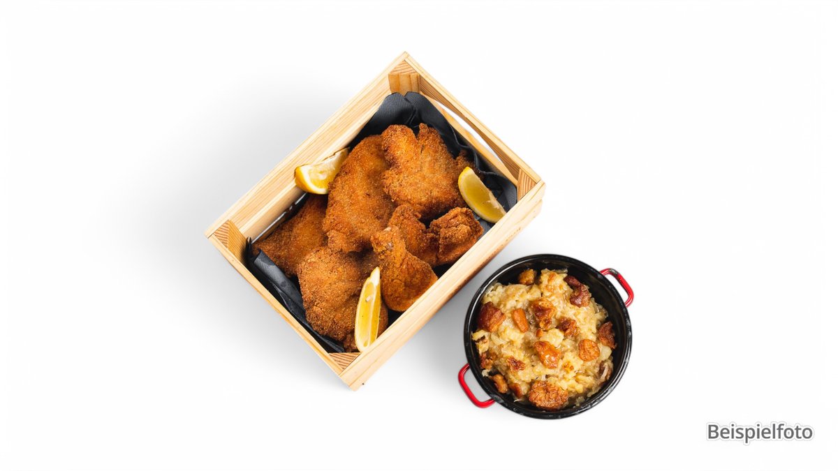 mit Schweinefleisch, geteilten Rippchen, 4x Nuggets, 4x Chicken Wings, Pommes frites, Tsatsiki, Barbecuesoße und Beilagensalat