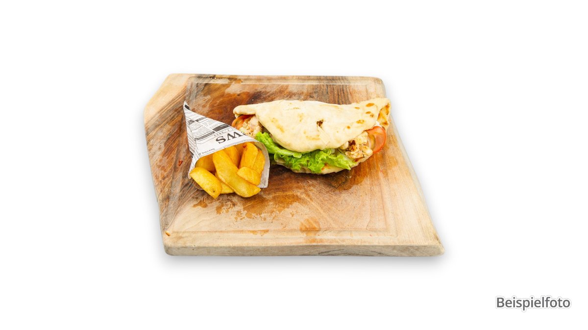mit Schweinefleisch, Pommes frites, Krautsalat, Zwiebeln und Tsatsiki