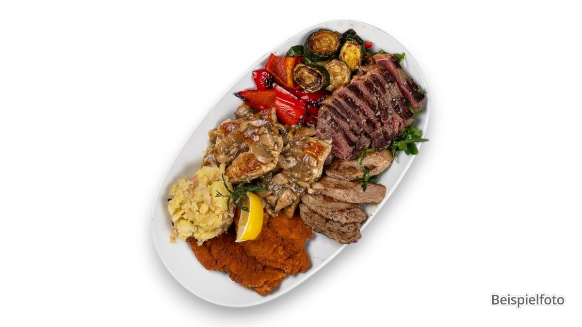 alle Gerichte werden mit grünem Salat, Paprika, Mais, Tomaten, Zwiebeln, scharfer mexikanischer Soße, Crème fraîche, überbackenem Käse, Reis, Bohnen und einer Tortillasorte deiner Wahl serviert