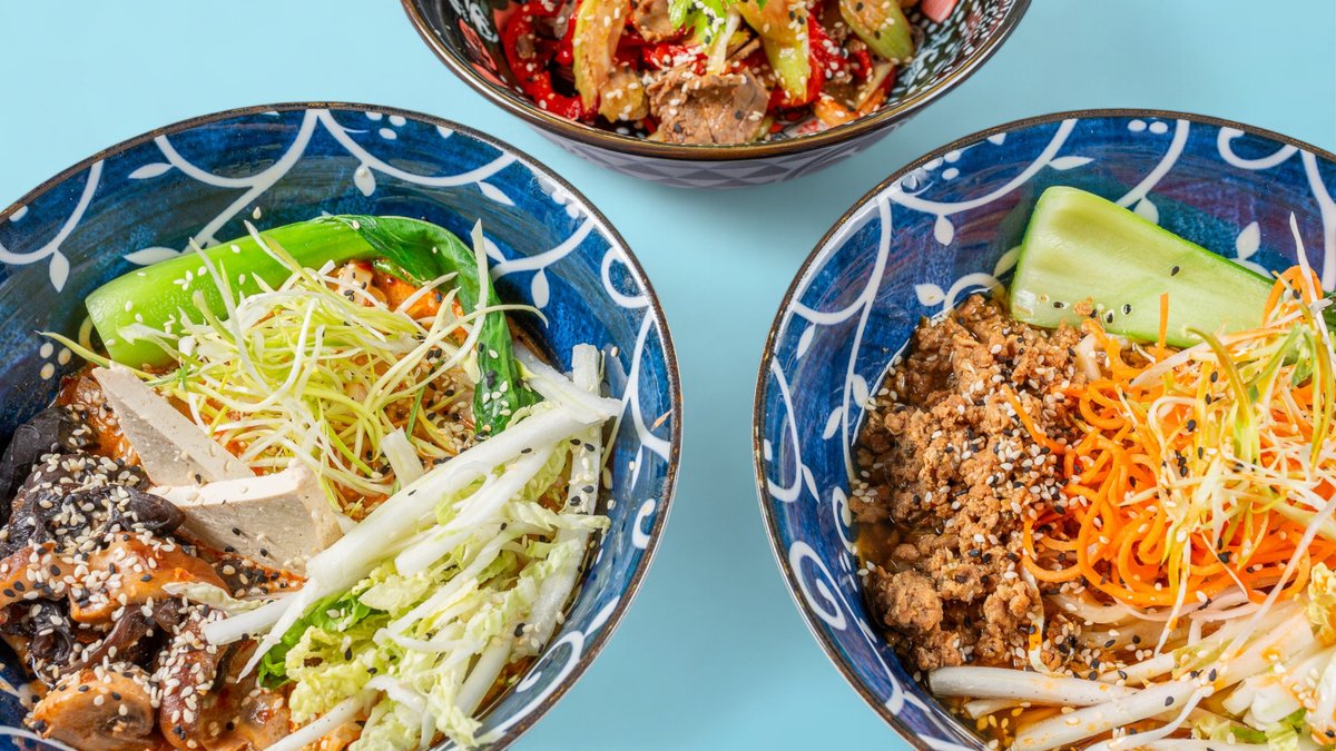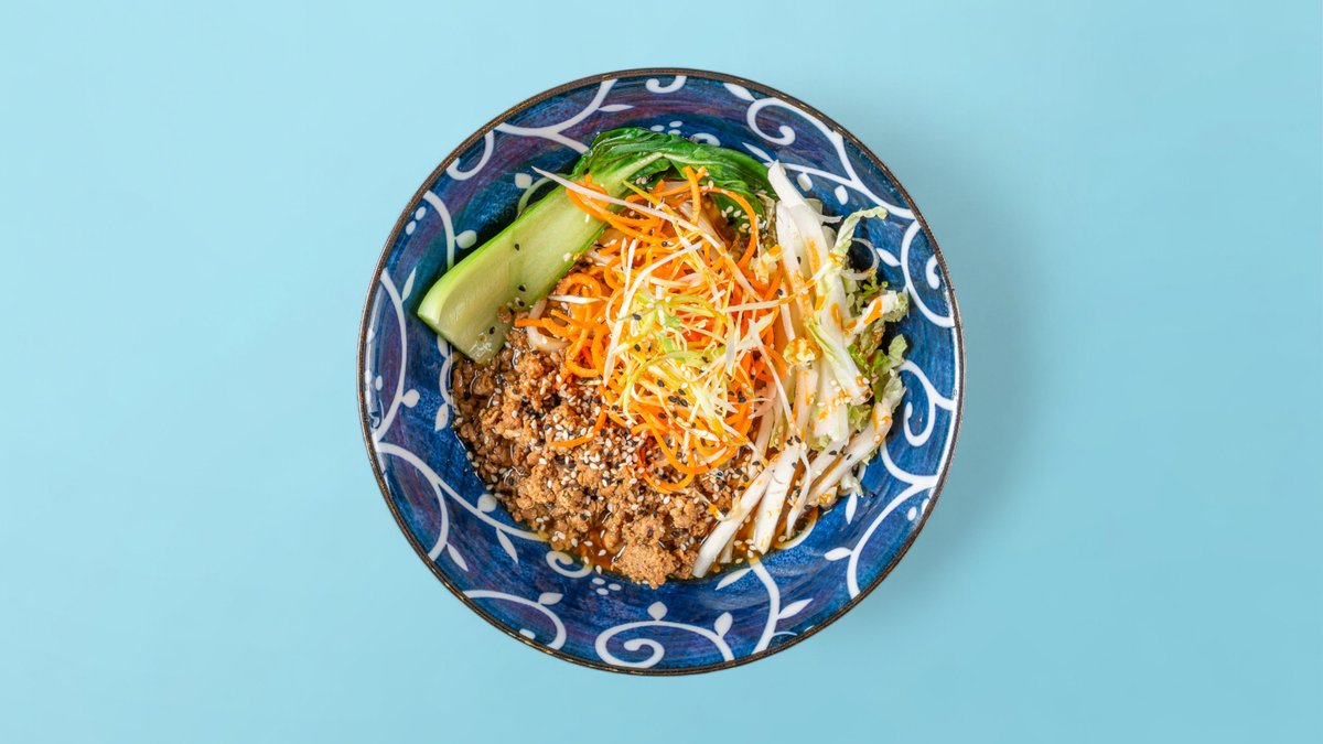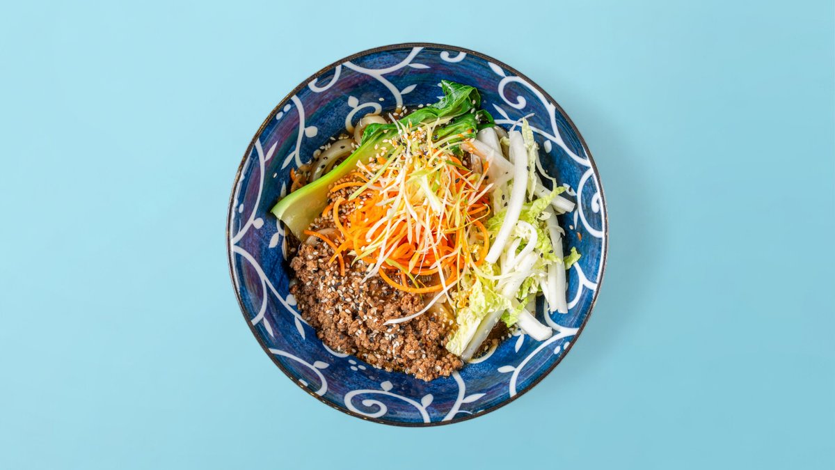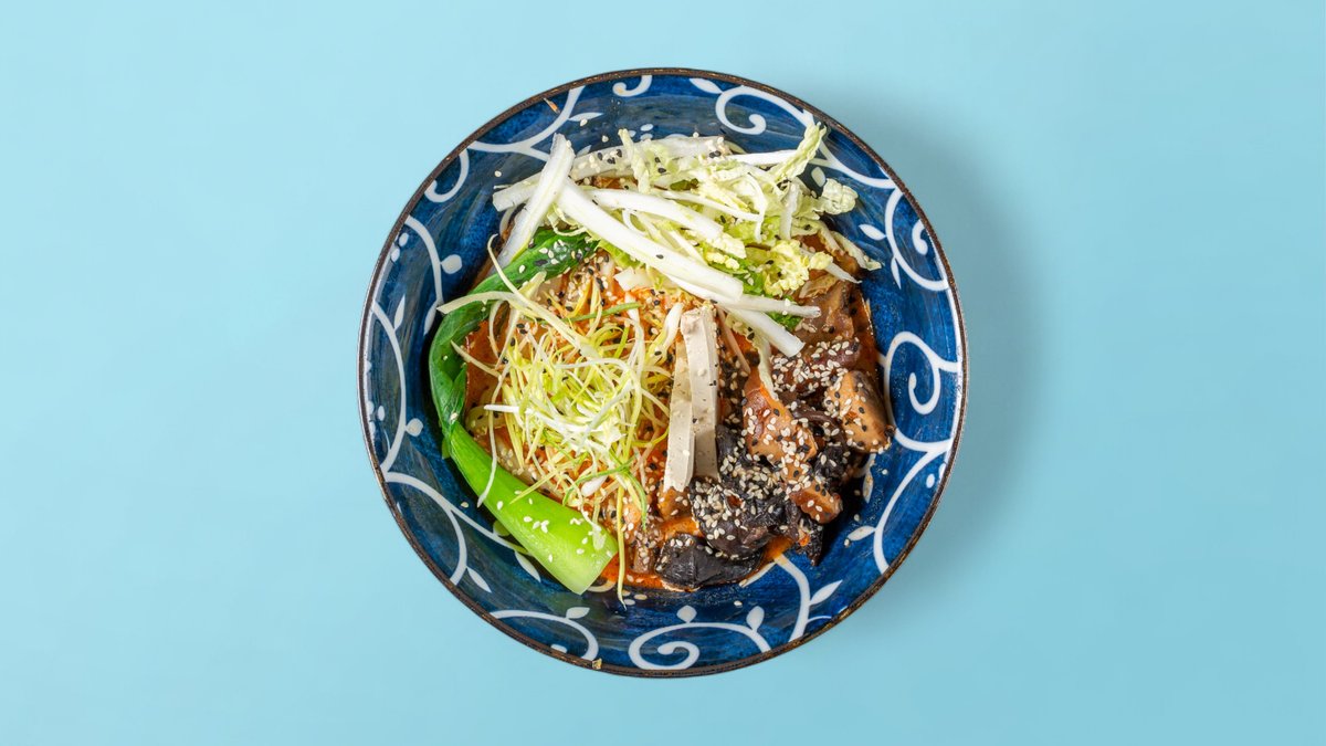 in cremiger Hafermilch-Suppe mit fermentierter Sichuan-Chili-Bohnenpaste, Tofu, Shiitake, Chinakohl und Bok Choy, verfeinert mit Lauch und Sesam