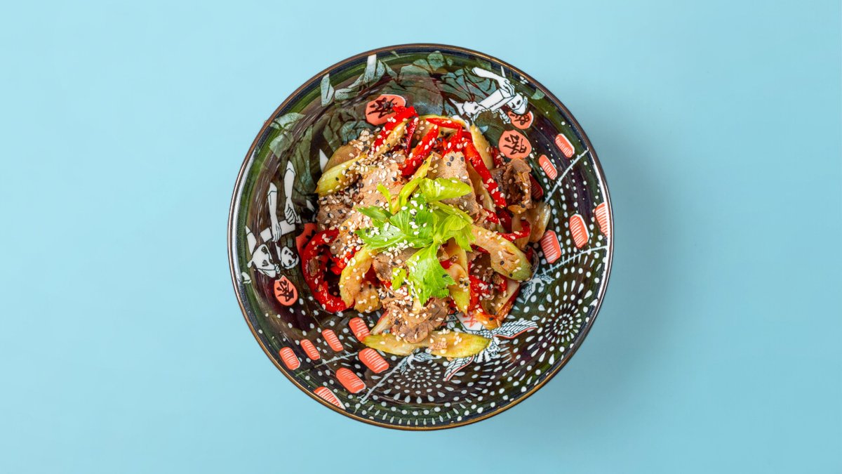 Langsam gegartes Rindfleisch mit roter und grüner Paprika, verfeinert mit hausgemachter Chilisoße, Sichuan-Pfefferöl und Sesamöl, abgerundet mit schwarzem und weißem Sesam