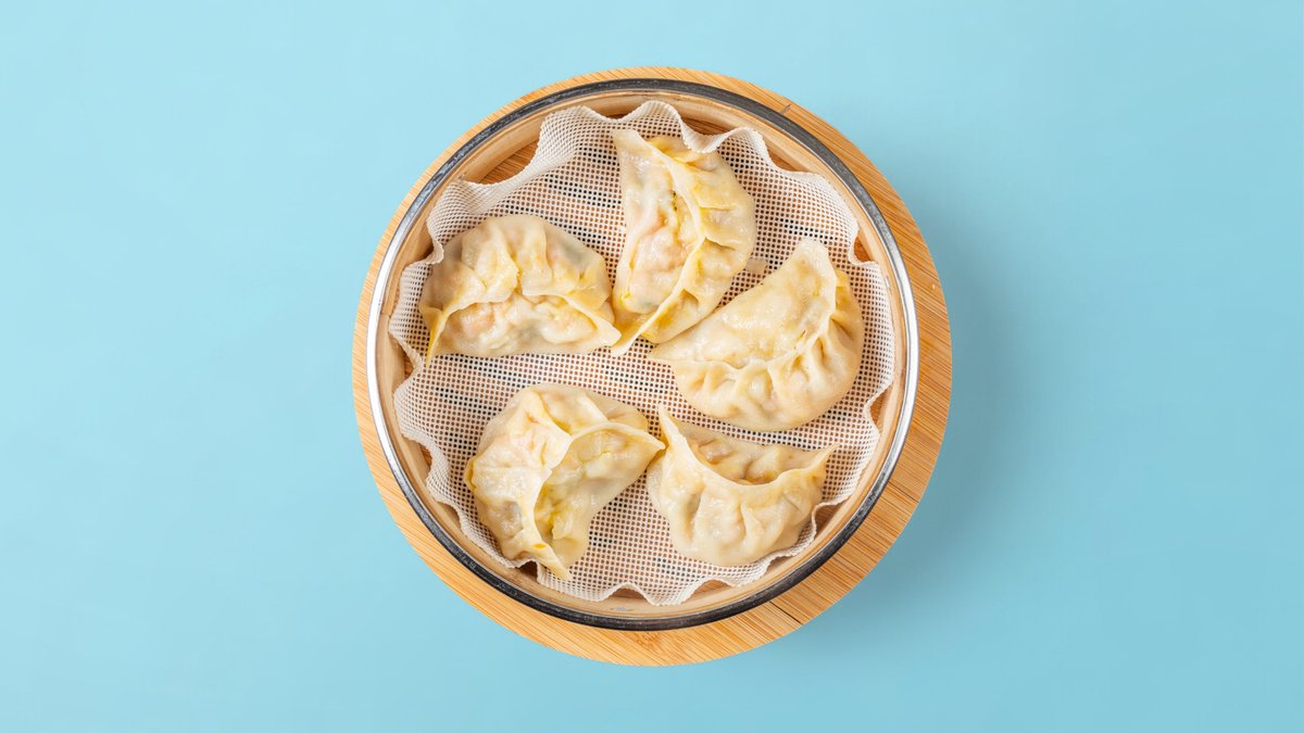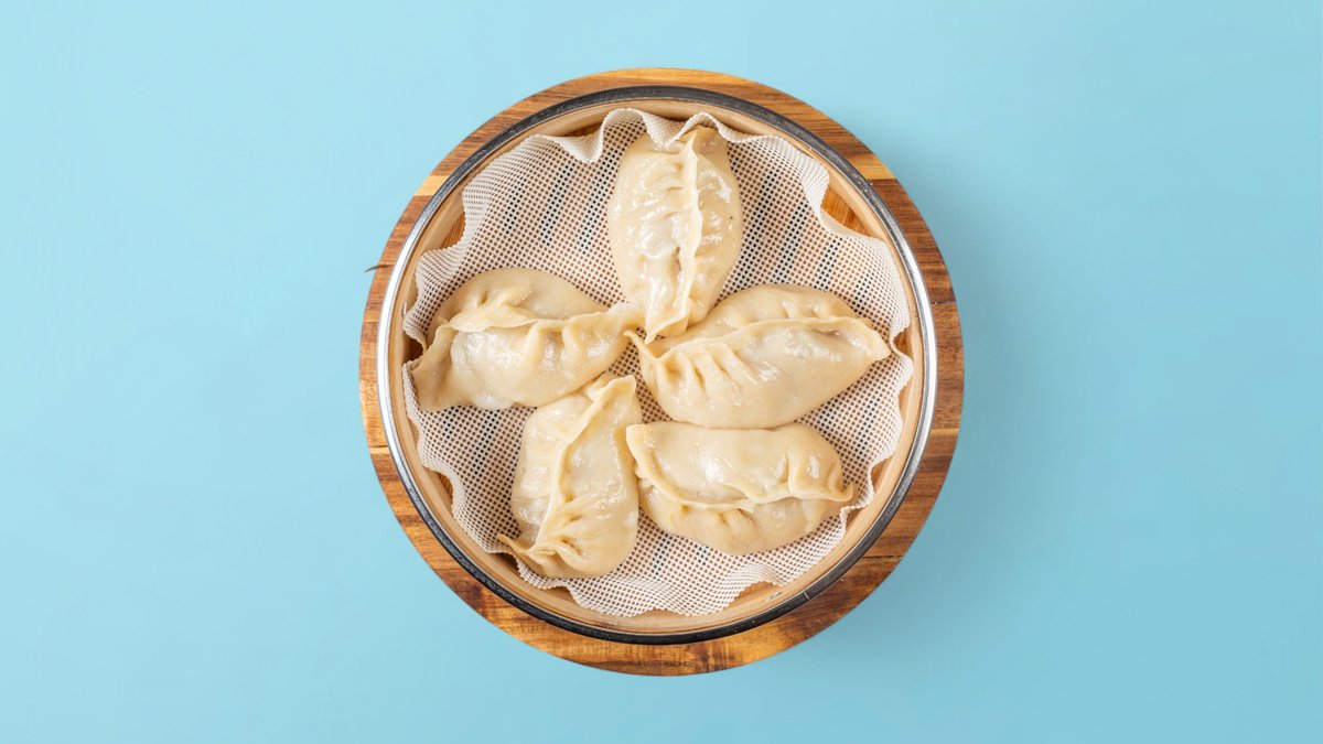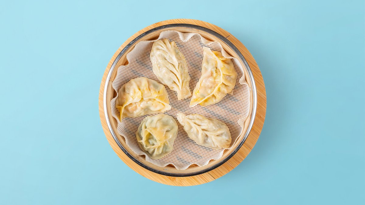 Handgewolftes Halal-Hühnerfleisch mit Zwiebeln und Frühlingszwiebeln, in handgerolltem Weizenteig gedämpft.